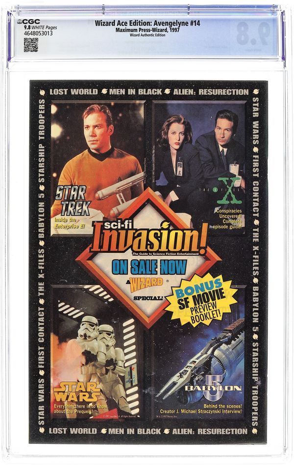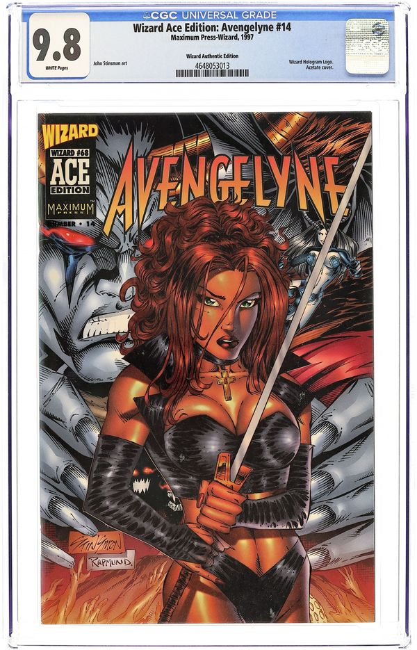Avengelyne Wizard Ace edition # 14. Reprints Avengelyne #1. This Wizard Ace Editions was available in issue 68. The print run does not exceed 5,000 for this book. New original cover art with acetate cover.