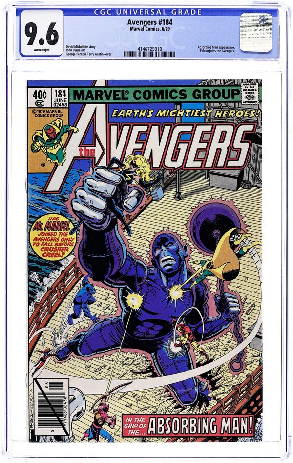 "The Redoubtable Return of Crusher Creel!" Part 1 of 2. Script by David Michelinie. Pencils by John Byrne. Inks by Klaus Janson. Cover by George Perez and Terry Austin. Ms. Marvel and the Falcon join the Avengers! And it won't be long before they see action! Down on the docks, Clint Barton is having lunch at a local diner when an angry patron bumps into him! It's Crusher Creel! Where did he come from? Forget that question. The better one is: who's going to stop him? Hawkeye makes a quick phone call to Avengers Mansion, and the battle is joined shortly thereafter! The Absorbing Man just wants to escape to South America, but Earth's Mightiest Heroes stand in his way! Meanwhile, Wanda and Pietro begin their cross-atlantic voyage to Europe with Django Maximoff. First 40¢ issue. Avengers Lineup: Beast, Captain America, Falcon, Hawkeye, Iron Man, Ms. Marvel, Vision, and the Wasp. (Notes: The Absorbing Man previously appeared in Incredible Hulk 209. The letters page includes a letter from comics writer Kurt Busiek.) 36 pages Cover price $0.40.