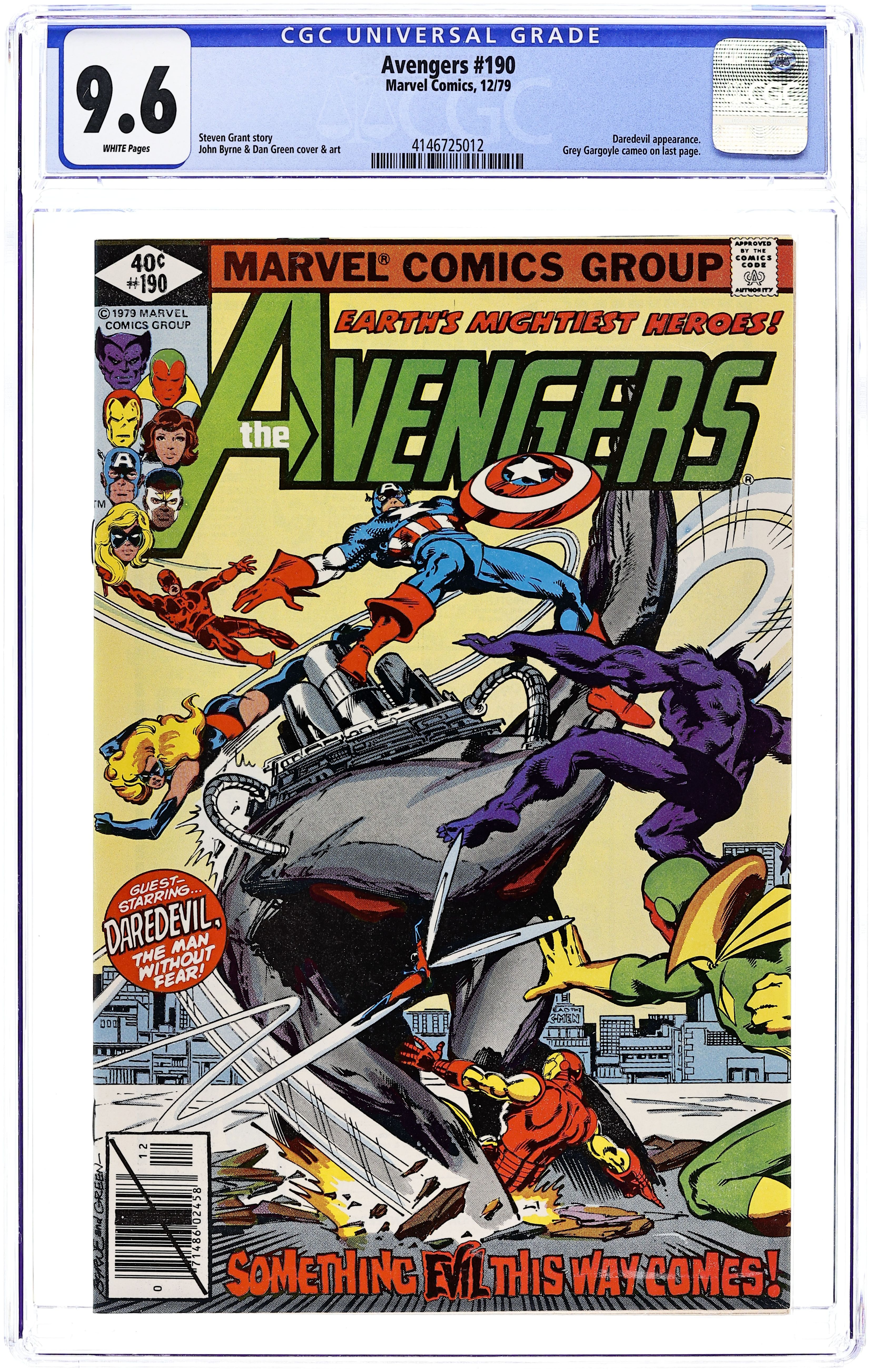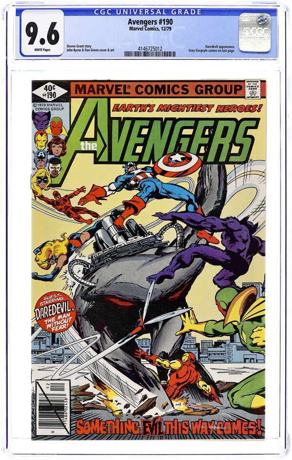 "Heart of Stone" Part 1 of 2. Guest-starring Daredevil. Script by Steven Grant. Pencils by John Byrne. Inks by Dan Green. Cover by John Byrne and Dan Green. Peter Gyrich is fed up with the Avengers constantly changing roster! So, he drags Earth's Mightiest Heroes before a special Senate hearing to break up the team! Will the federal government succeed in doing what the likes of Kang, Ultron, and the Grim Reaper have failed to do through the years? Meanwhile as the Senate proceedings take place, a strange grey creature violently moves thru the New York subway system towards Manhattan! Who's going to stop the mysterious monster once it emerges on the streets? Are the Avengers available...or will red tape keep them in the courtroom? Cameo appearance by the Grey Gargoyle. Flashback cameos by Graviton and Ultron. Avengers Lineup: Beast, Captain America, Falcon, Ms. Marvel, Scarlet Witch, Vision, Wasp, and Wonder Man. (Note: The Grey Gargoyle previously appeared in Thor 259.) 36 pages Cover price $0.40.