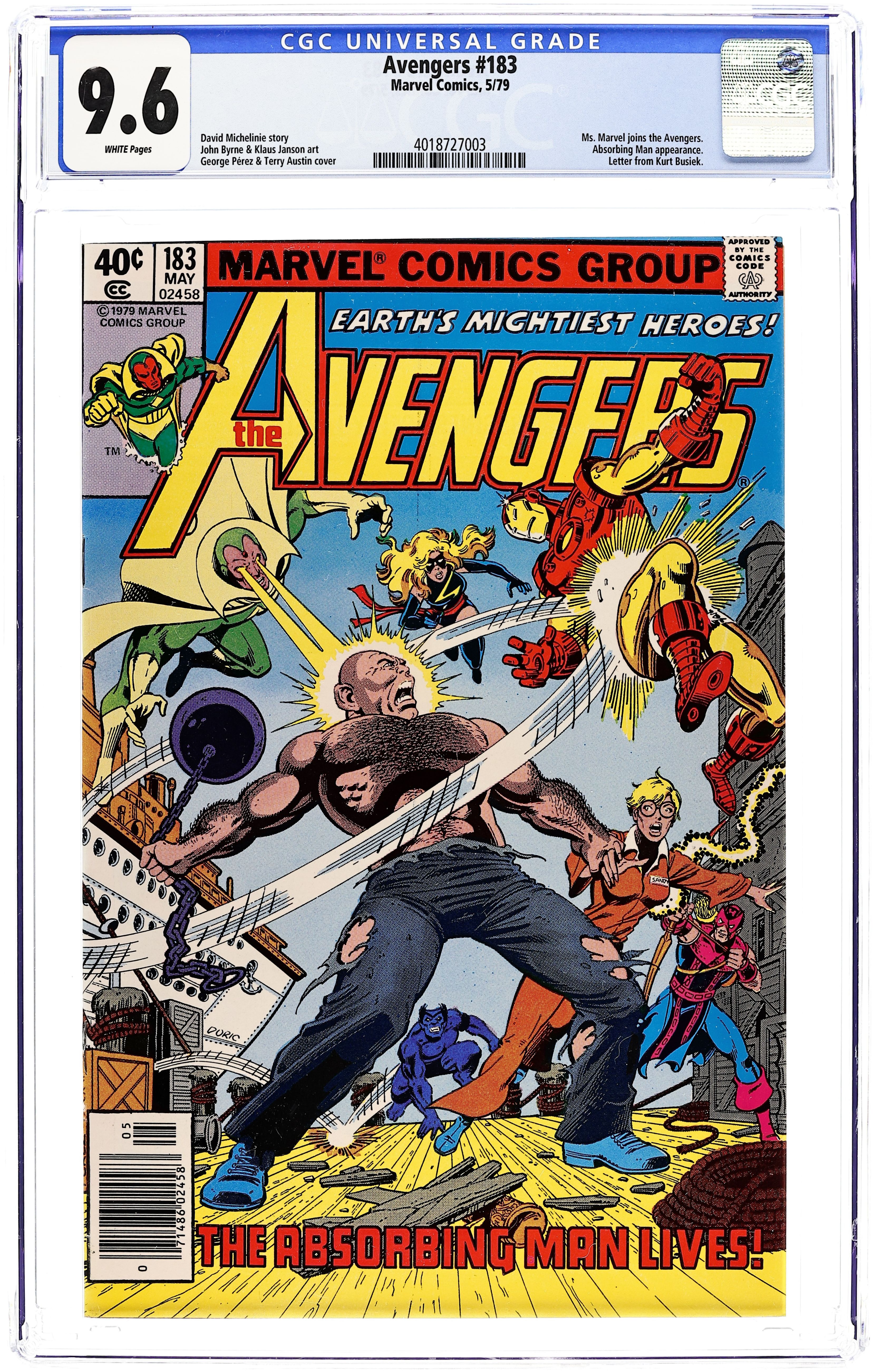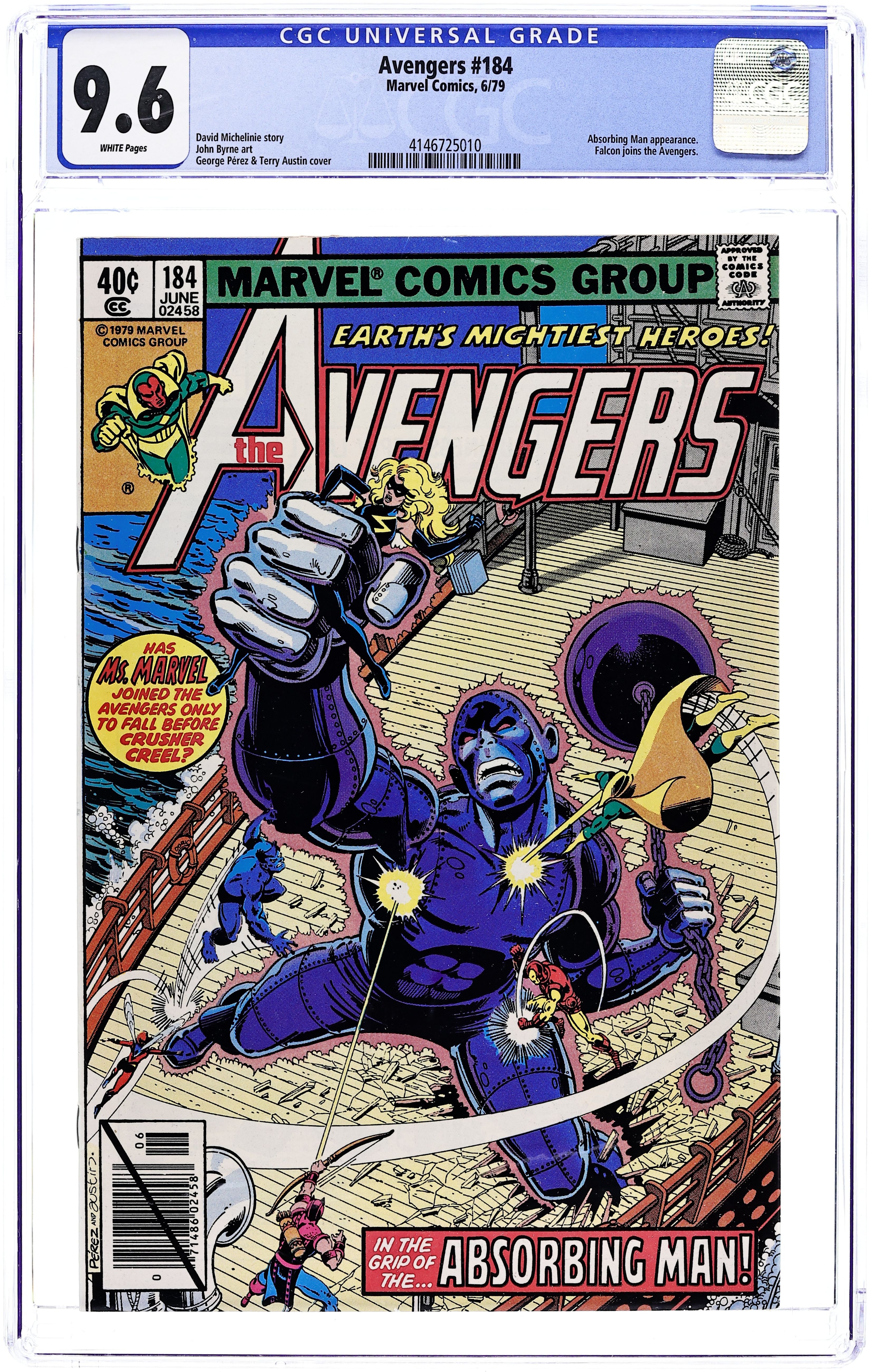 Direct Edition. "Death on the Hudson!"" Part 2 of 2. Script by David Michelinie. Pencils by John Byrne. Inks by Diverse Hands. Cover by George Perez and Terry Austin. The Avengers and the Absorbing Man throw down on the docks! No less than eight avengers will try to stop the rampaging Crusher Creel from destroying New York harbor! The Beast, Iron Man, Ms. Marvel, and the Vision all get their shots, but the Absorbing Man is one tough customer! This is going to take a team effort! (Notes: The Absorbing Man returns in Incredible Hulk 261. Terry Austin, Klaus Janson, and Joe Rubinstein are thought to be among the inkers contributing to this issue.) 36 pages Cover price $0.40.