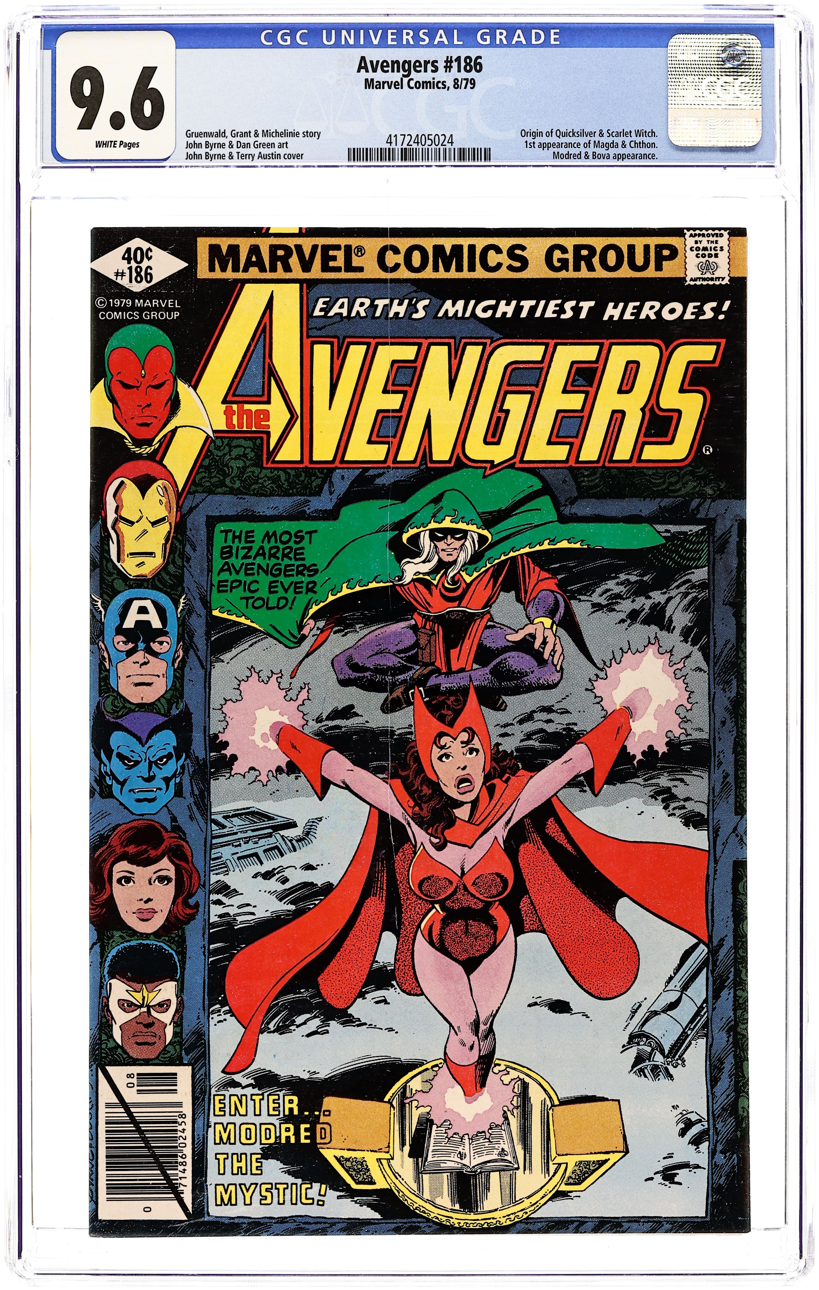 Direct Edition. "The Yesterday Quest!" Part 1 of 3. Plot by Mark Gruenwald and Steven Grant. Script by David Michelinie. Pencils by John Byrne. Inks by Dan Green. Cover by George Perez and Terry Austin. Ever since their first appearance in Uncanny X-Men 4 many years ago, the origin of Quicksilver and the Scarlet Witch has been a mystery to both comic readers and the siblings alike. After Wanda and Pietro arrive in Transia with Django Maximoff, clues to the twins' birthplace and birth parents begin to emerge. Modred the Mystic, the Darkhold, Bova the cow-woman, the High Evolutionary's former citadel, and Wundagore Mountain are all pieces to the puzzle. And the truth seems to lie at the top of the mountain. But there's something else at the top of Wundagore Mountain. Something ancient, something evil. Cameo appearance by Bova. Flashback cameos by Robert Frank, Madeline Frank, and the Toad. Avengers Lineup: Beast, Captain America, Falcon, Hawkeye, Iron Man, Jocasta, Ms. Marvel, Quicksilver, Scarlet Witch, Vision, and the Wasp. (Notes: Mark Gruenwald's participation in this three-part story was an indication of the storyline's importance to the continuity of the Marvel Universe. Modred previously appeared in Marvel Two-in-One 33. This issue includes a full-page ad for the Man-Thing's guest appearance in Micronauts 7.) 36 pages Cover price $0.40.
