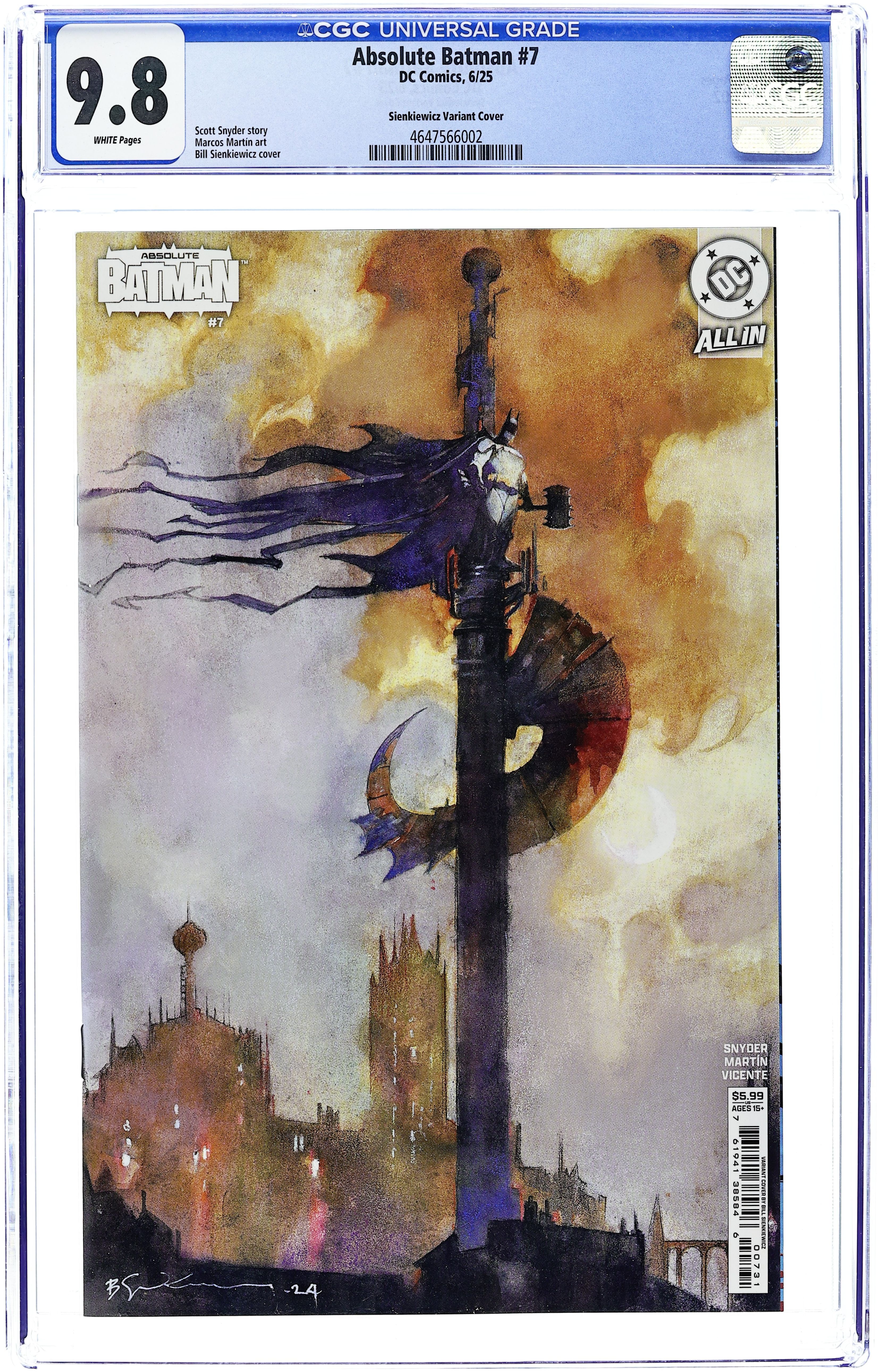 Written by Scott Snyder. Art by Marcos Martin. Cover by Bill Sienkiewicz. THE JOKER AND MR. FREEZE MAKE THEIR ABSOLUTE UNIVERSE DEBUT--STARTING HERE! It's about to get icy cold in Gotham City...as we reveal the connections between a young, up-and-coming scientist named Victor Fries, his history with the Ark M experiment, and what it all has to do with the mysterious Joker. A bombastic two-parter with a guest artist, the one and only super-star Marcos MartÃn, starts here! 32 pages, full color. Rated T+ Cover price $5.99.