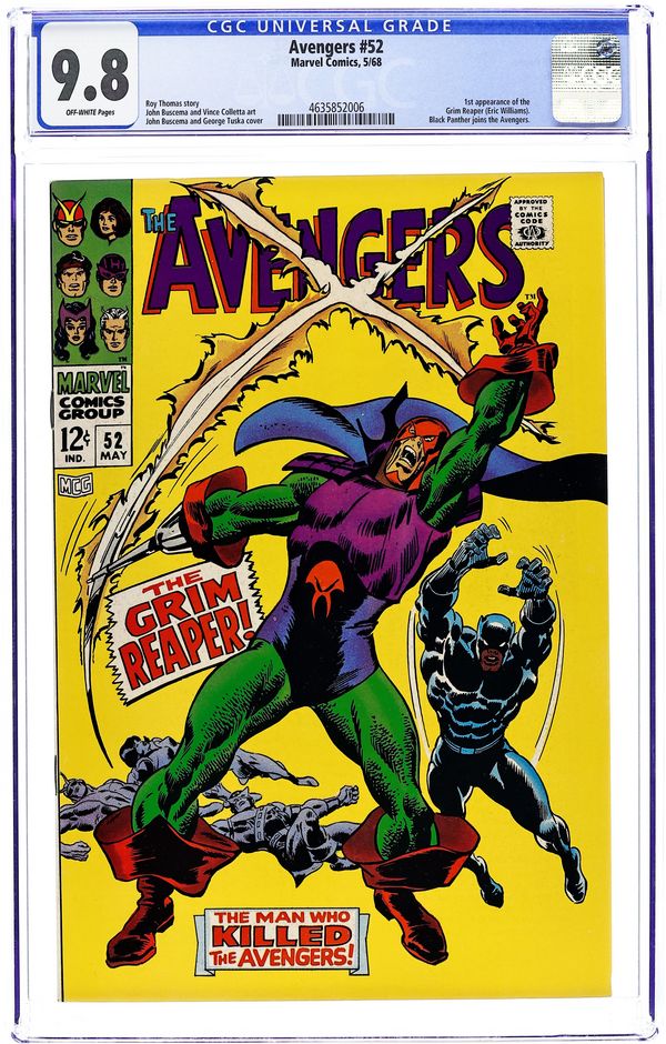First appearance of the Grim Reaper in "Death Calls for the Arch-Heroes!" Script by Roy Thomas. Pencils by John Buscema. Inks by Vince Colletta. Cover by John Buscema. The Black Panther arrives at Avengers Mansion ready to join Earth's Mightiest Heroes! However when T'Challa reaches the main meeting room, he finds his three would-be teammates lying on the floor unconscious! The panther begins to render first aid, but Jasper Sitwell suddenly appears and arrests him for murder! While being transported to and questioned at the local police station, T'Challa puts the evening's strange pieces together! And the newest avenger rushes back to the mansion to face the true perpetrator! Wow, the Black Panther vs. the Grim Reaper! What a debut for the superhero and the super-villain! Cameo appearances by the Black Widow, Tony Stark, Captain America, and Thor. Flashback cameo by Wonder Man to recap the events of Avengers #9. Avengers Lineup: Black Panther, Goliath, Hawkeye, and the Wasp. (Notes: The Grim Reaper (aka Eric Williams) returns in Avengers #78 to continue his quest for revenge. The letters page includes a letter from comics writer Mike Uslan. This issue was reprinted in Marvel Triple Action #44.) 36 pages. Cover price $0.12.