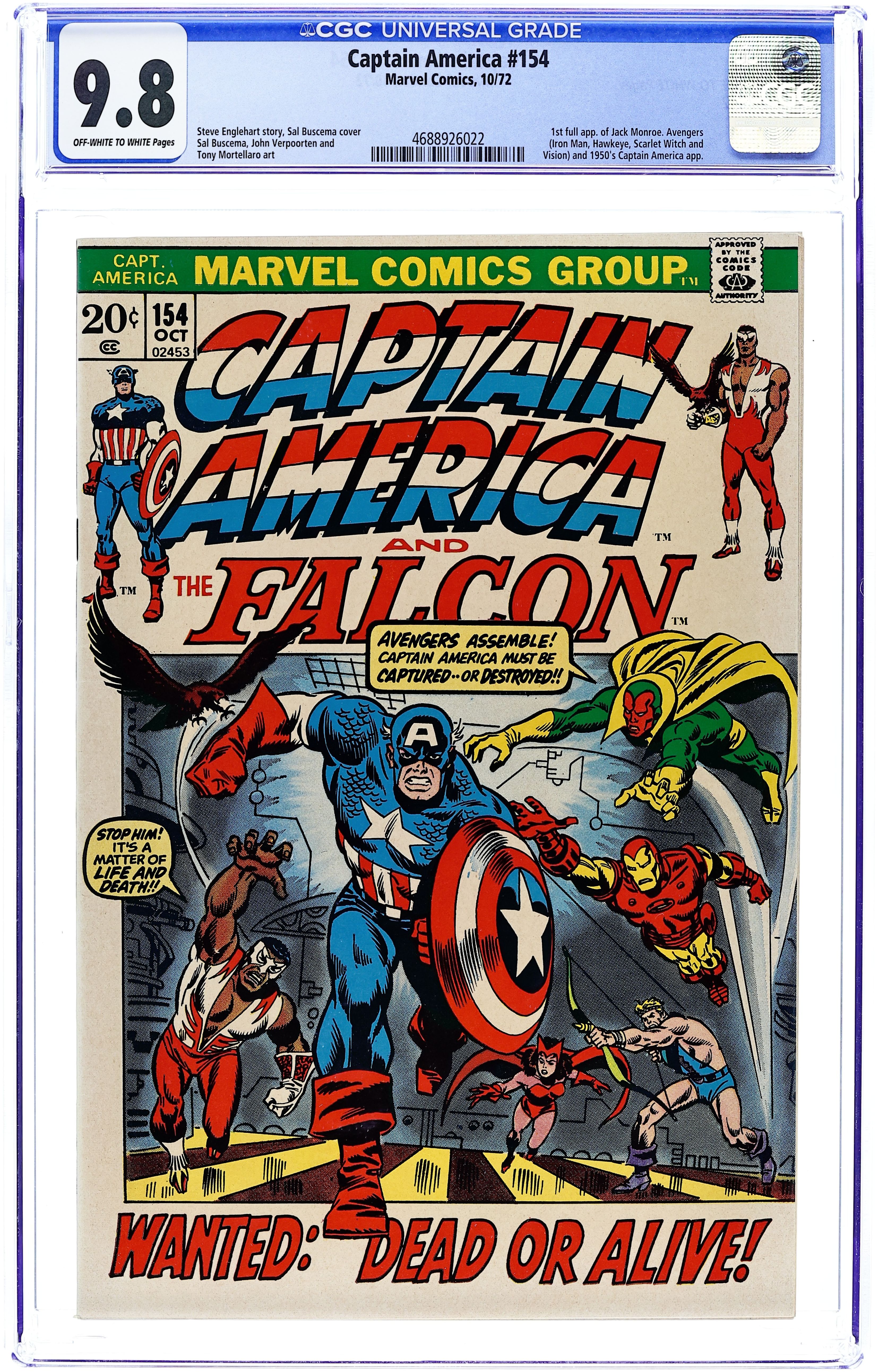 First (full) appearance of Jack Monroe (as Bucky) in "The Falcon Fights Alone!" Part 2 of 4. Script by Steve Englehart. Pencils by Sal Buscema. Inks by John Verpoorten. Cover by Sal Buscema and Frank Giacoia. Captain America and Bucky are back! But how is this possible? That's what the Falcon is wondering as he trades blows with the costumed pair on the streets of Harlem. Eventually, the Falcon falls in battle, but the local residents drive off his red, white, and blue attackers. After catching his breath, Sam Wilson rushes to Avengers Mansion to find transportation to the Bahamas -- in order to warn his partner. But the Falcon is too late! The new Cap and Bucky are already on their way south to waylay the star-spangled avenger! Cameo appearances by Steve Rogers, Sharon Carter, Leila Taylor, Brian Muldoon, Jarvis, Hawkeye, Iron Man, Scarlet Witch, and the Vision. 36 pages. Cover price $0.20.