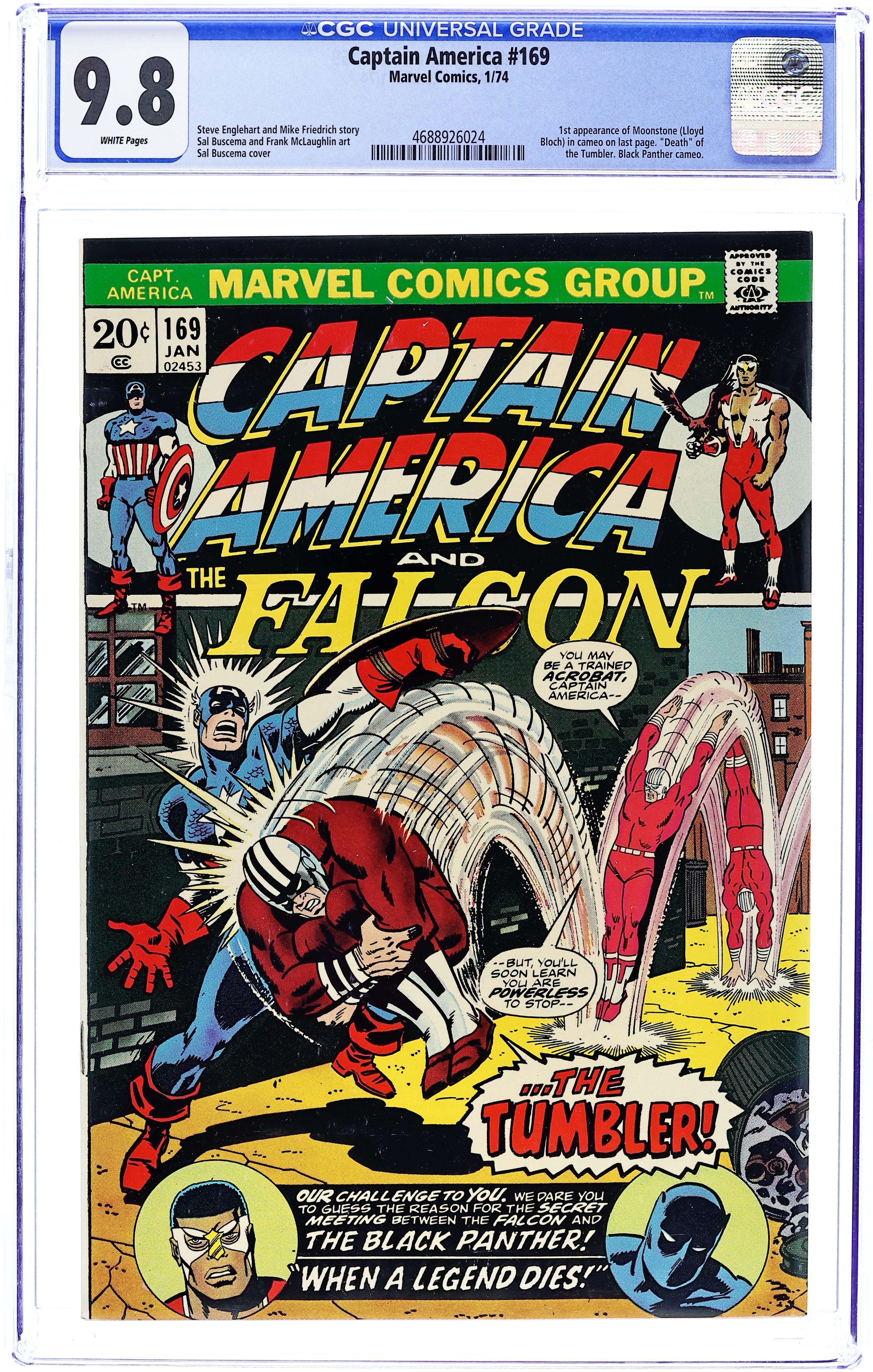 "When a Legend Dies!" Plot by Steve Englehart. Script by Steve Englehart (pp 1-9) and Mike Friedrich (pp 10-19). Pencils by Sal Buscema. Inks by Frank McLaughlin. Cover by Sal Buscema. In recent days Cap has seen and heard advertisements on TV and radio -- accusing the star-spangled avenger of being a reckless vigilante and unworthy of the public's trust. The Living Legend is taken aback by the negative ads and seeks out the organization responsible: the Committee to Regain America's Principles. Why is this group with its leader, Quentin Harderman, coming after Captain America? Inauspiciously, Cap's pursuit of the answer must wait once the Tumbler appears! And wait even longer when the battle vs. the Tumbler takes a deadly turn! Meanwhile, the Falcon seeks help from the Black Panther inupgrading his fighting gear. First (cameo) appearance of Lloyd Bloch (aka the first Moonstone). Cameo appearances by Sharon Carter, Leila Taylor, and Contessa Valentina Allegra de la Fontaine. (Notes: The Tumbler previously appeared in Tales of Suspense #83. The letters page includes a letter from writer Charles Hoffman. This issue was reprinted in 2005 in the trade paperback: Captain America and the Falcon Secret Empire. The TPB collects issues 169 thru 176.) 36 pages. Cover price $0.20.