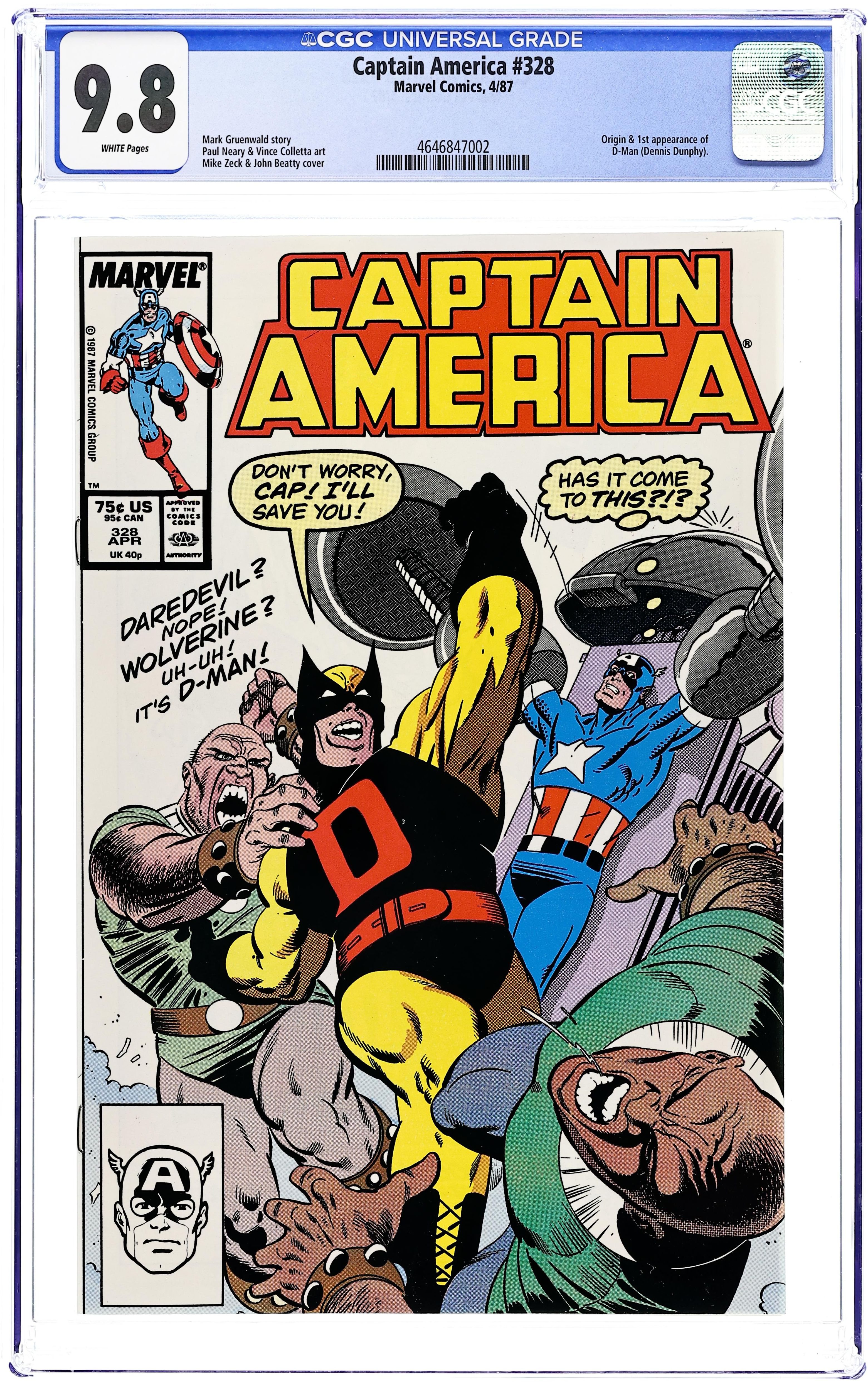 1st appearance & origin of D-Man. "The Hard Way!" Story by Mark Gruenwald. Art by Paul Neary and Vince Colletta. Cover by Mike Zeck and John Beatty. Captain America pays a visit to the Unlimited Class Wrestling Federation training center and meets Dennis Dunphy (aka Demolition Man). The duo decides to work together to find the mysterious Power Broker, but first they encounter Dr. Karl Malus. Cap is offered the opportunity to have his strength augmented. What choice will he make? First appearance and origin of Demolition Man. 36 pages Cover price $0.75.