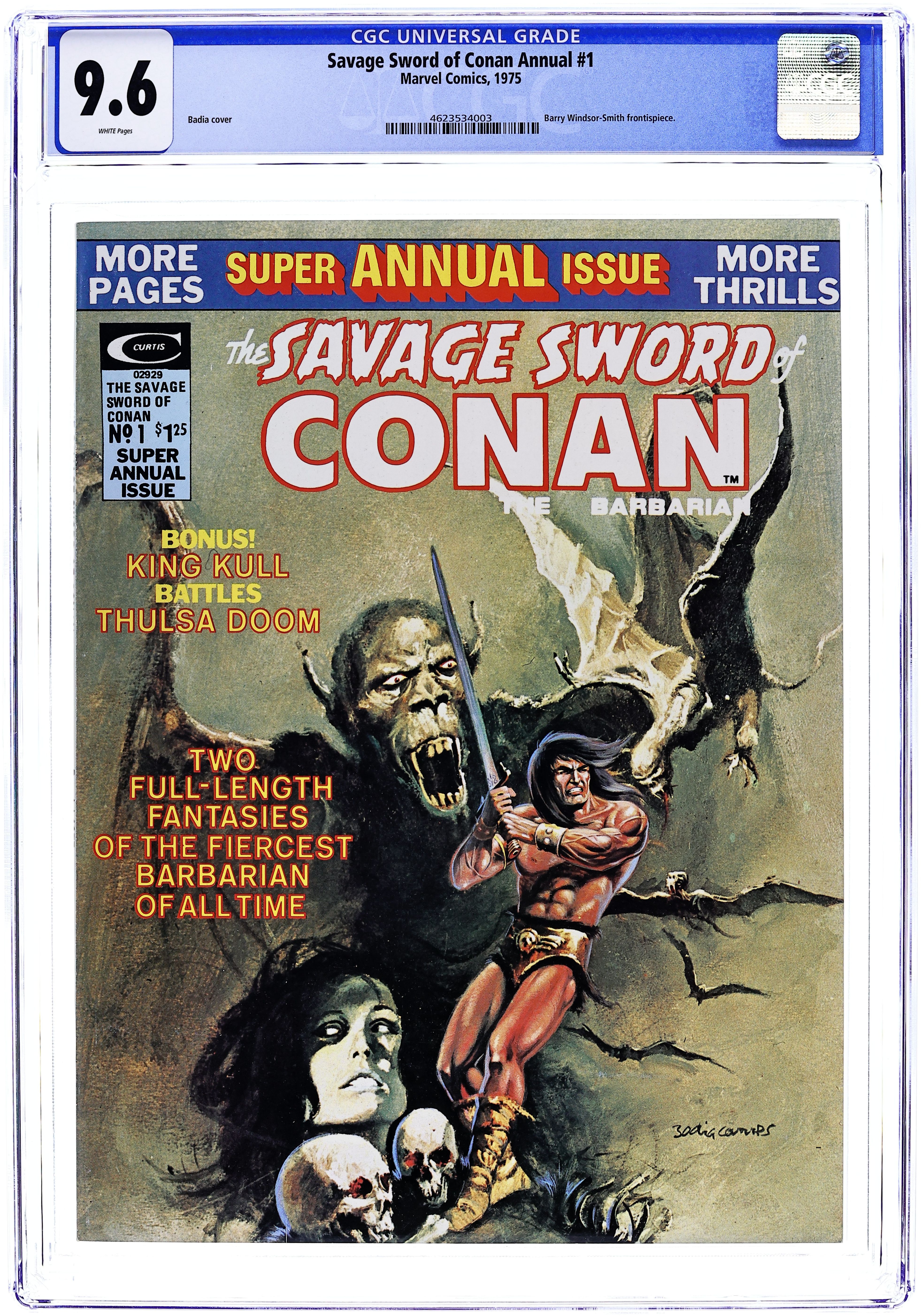 Summer 1975. Conan reprints: "Beware the Wrath of Anu" (script by Roy Thomas, pencils by Barry Windsor-Smith, inks by Sal Buscema; from Conan the Barbarian 10) and "The Web of the Spider-God" (also by Thomas/Windsor-Smith/Buscema, from a plot by John Jakes; from Conan the Barbarian 13). Kull reprints: "The Forbidden Swamp" (script by Thomas, pencils by Marie Severin, inks by John Severin) and "The Death-Dance of Thulsa Doom!" (also by Thomas/Severin/Severin). Windsor-Smith frontispiece (reprint). Badia cover. Cover price $1.25.