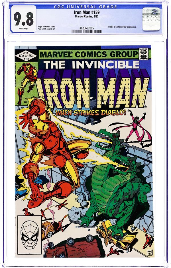 Direct Edition. "When Strikes Diablo" Story by Roger McKenzie. Art by Paul Smith. Stark International has hired a new employee who turns out to be a super villain with amnesia. When Diablo regains his memory, he engages Iron Man in an all-out battle. Cameo appearance by the Fantastic Four. (Note: This issue contains a full page ad for Marvel's first limited series: Marvel Super Hero Contest of Champions.) 32 pages Cover price $0.60.