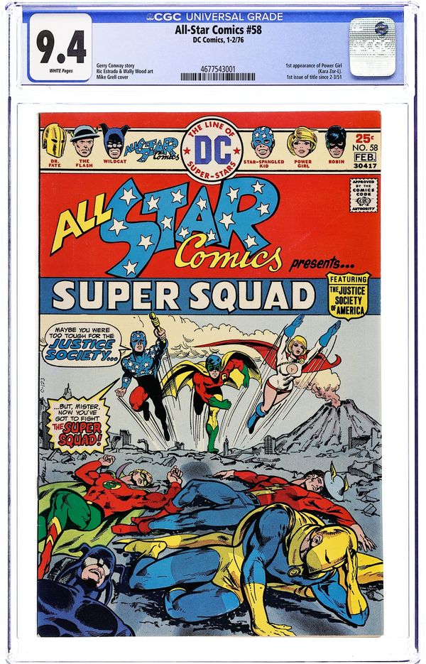 1st appearance of Power Girl. Cover art by Mike Grell. The Super Squad! starring the All Star Super Squad, script by Gerry Conway, pencils by Ric Estrada, inks by Wally Wood; Power Girl describes the Super Squad as a strike force composed of the JSA and the three younger heroes--Robin, Power Girl, and Star-Spangled Kid. Letters from Roy Thomas and Jerry Bails. The Captive Commissioner Hostess ad starring Batman, pencils by Curt Swan, inks by Vince Colletta. 36 Pages, Full Color. Cover price $0.25.