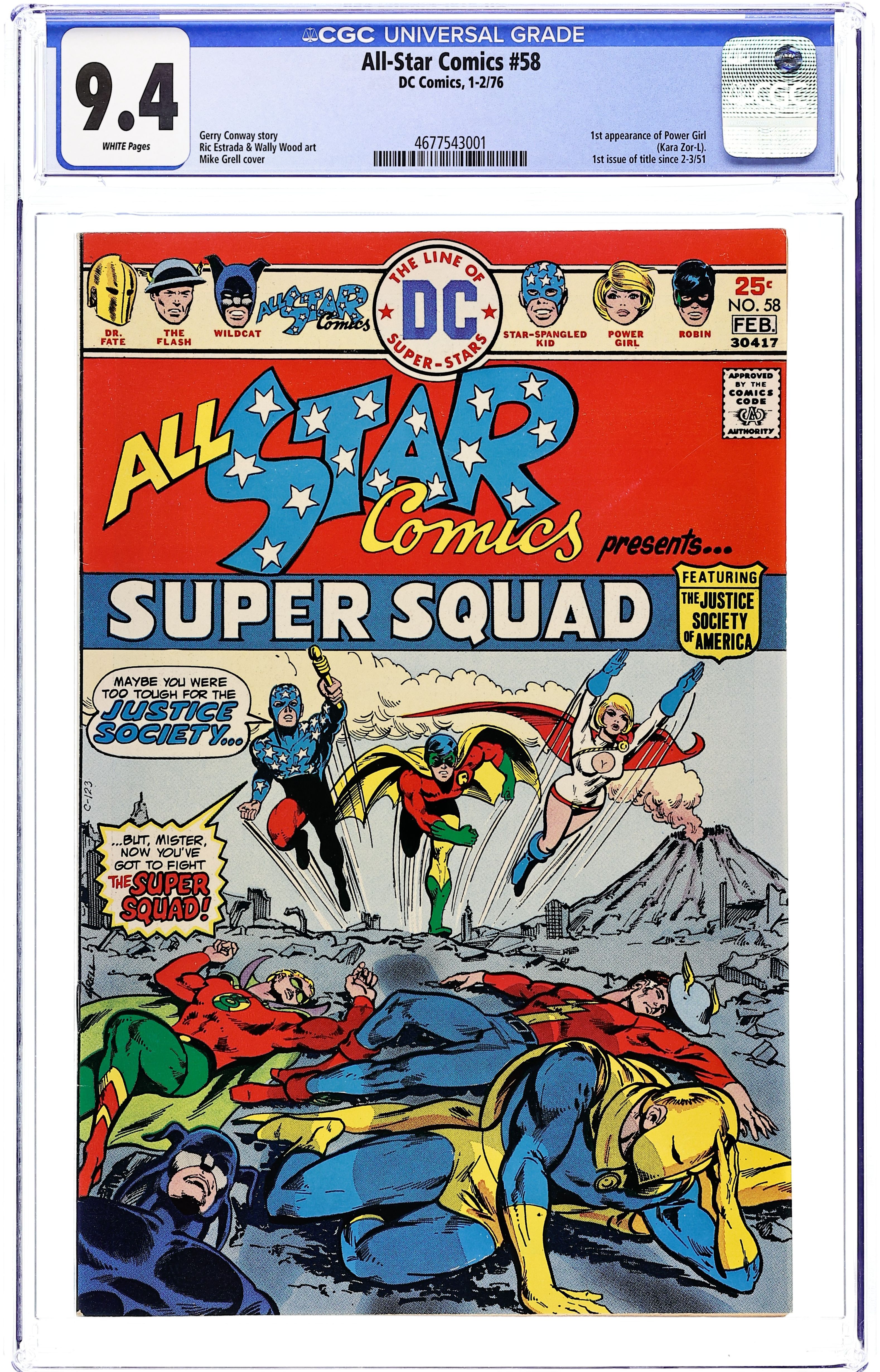 Starts Feb 16 1st appearance of Power Girl. Cover art by Mike Grell. The Super Squad! starring the All Star Super Squad, script by Gerry Conway, pencils by Ric Estrada, inks by Wally Wood; Power Girl describes the Super Squad as a strike force composed of the JSA and the three younger heroes--Robin, Power Girl, and Star-Spangled Kid. Letters from Roy Thomas and Jerry Bails. The Captive Commissioner Hostess ad starring Batman, pencils by Curt Swan, inks by Vince Colletta. 36 Pages, Full Color. Cover price $0.25.