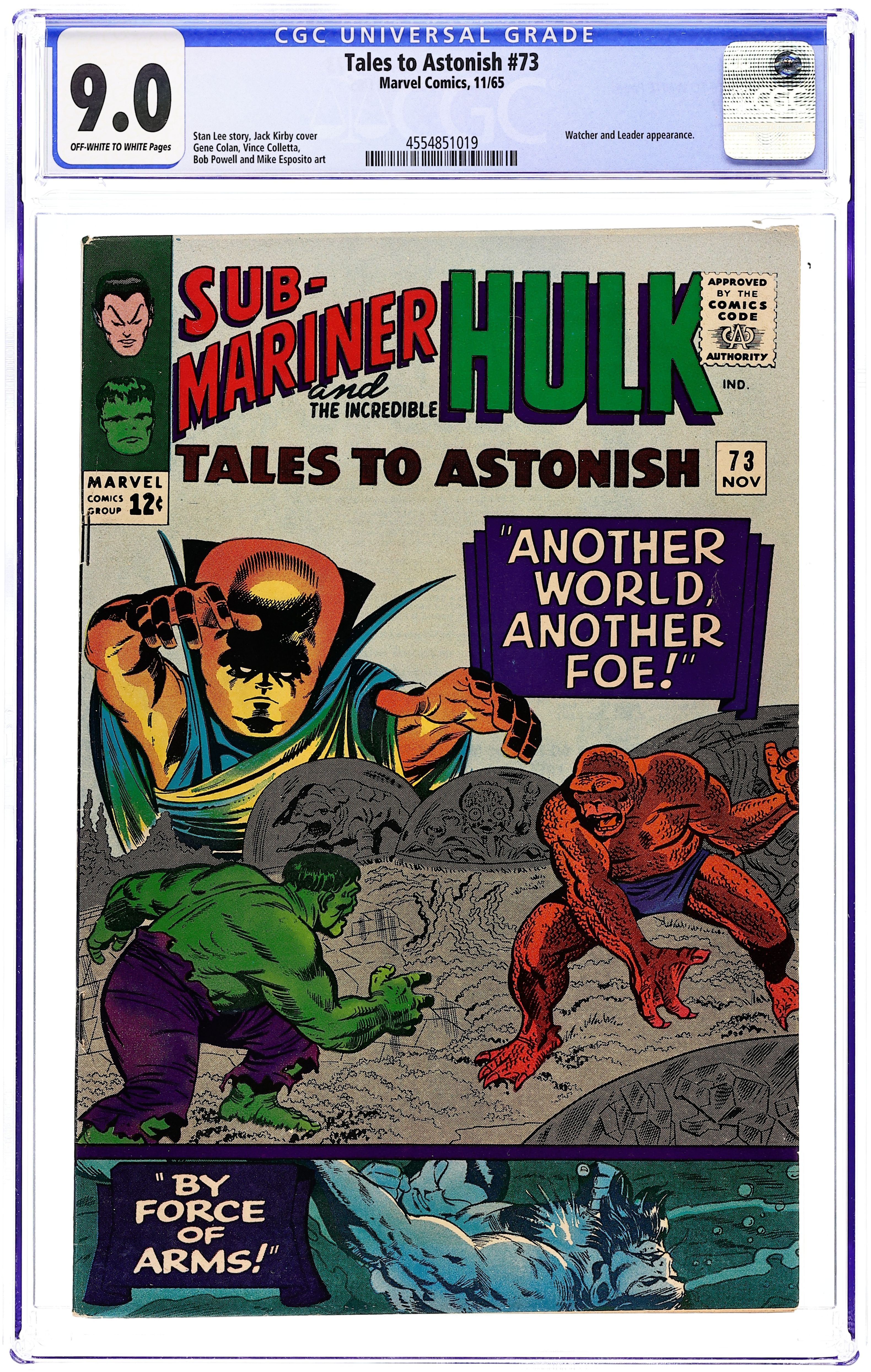 Cover by Gene Colan, Bob Powell, Vince Colletta, and Mike Esposito. When Fails the Quest!, script by Stan Lee, art by Gene Colan (as Adam Austin) and Vince Colletta; Sub-Mariner battles The Faceless Ones to try to save Dorma while Krang stops a rebellion in Atlantis. The Wisdom of the Watcher!, script by Stan Lee, art by Jack Kirby, Bob Powell, and Mike Esposito (as Mickey Demeo); The Hulk fights the baddest alien in the galaxy over the Watcher's ultimate machine; After the battle, the Watcher allows Hulk to take it and he is teleported back to the Leader's lair; The Leader tries to use the machine which dispenses all of the Watcher's collected knowledge but even his big brain can't handle it and the strain kills him. 36 pgs., full color. $0.12. Cover price $0.12.