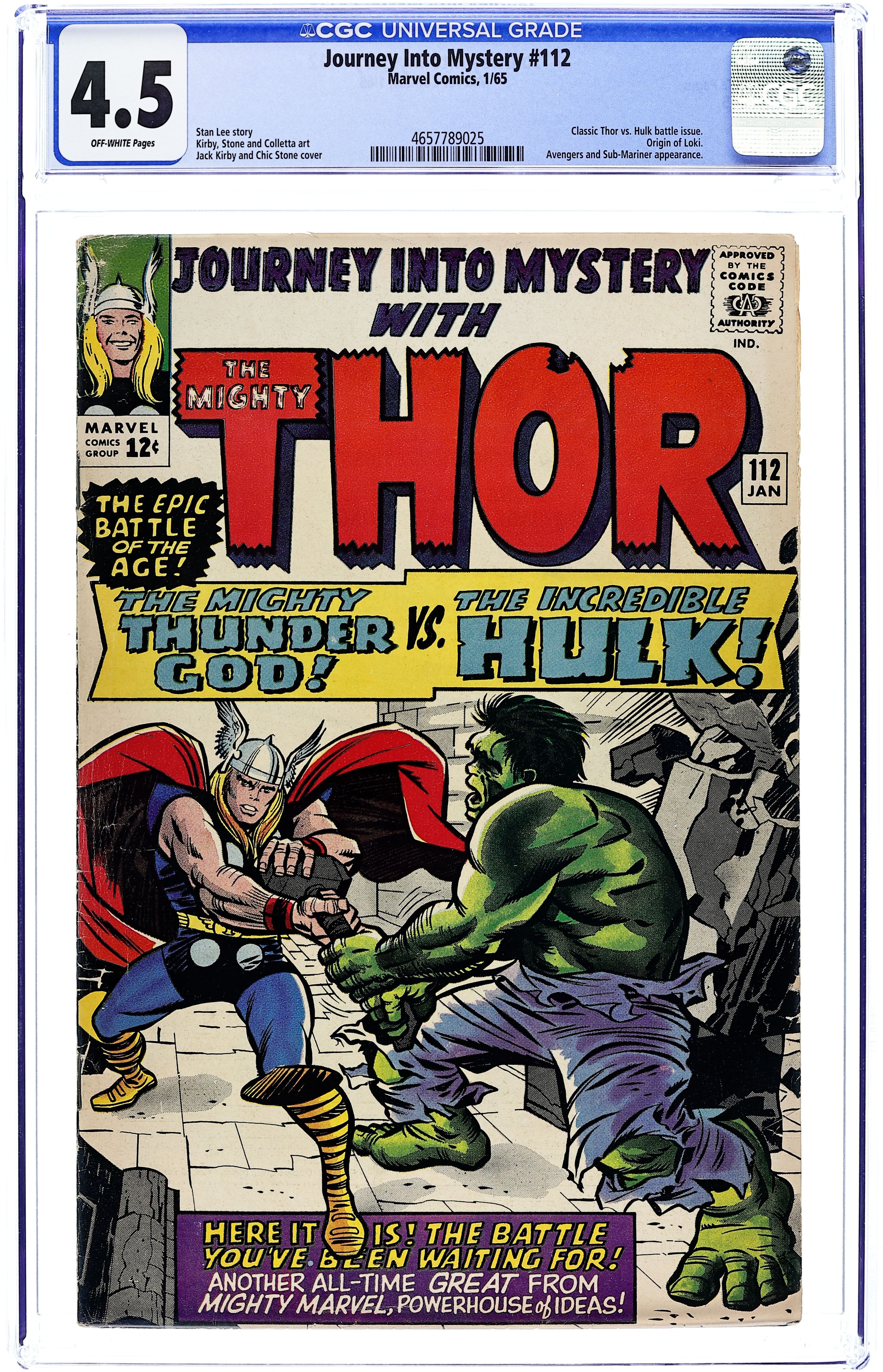 Cover pencils by Jack Kirby, inks by Chic Stone. "The Mighty Thor Battles the Incredible Hulk!", script by Stan Lee, pencils by Jack Kirby, inks by Chic Stone; Two rival fan clubs are debating who is stronger, Thor or the Hulk?; Thor happens to be passing by and drops in to offer his opinion; He relates the story of their epic battle (in Avengers #3) and describes a previously unseen scene in which he and the Hulk tussle; He goes into deep thought and when pressed, cannot say who is the stronger because he has insufficient proof!; Guest appearances by the Avengers (Iron Man, the Sub-Mariner, Giant-Man, and the Wasp) and Odin. "Tales of Asgard" back-up: "The Coming of Loki!", script by Stan Lee, pencils by Jack Kirby, inks by Vince Colletta; The Asgardians battle the Giants. Laufey, King of the Giants of Jotenheim, is slain; A bundle of cloth is found. It contains a baby; Odin adopts the child and names him Loki. The Merry Marvel Marching Society promo. 36 pgs., full color. Cover price $0.12.