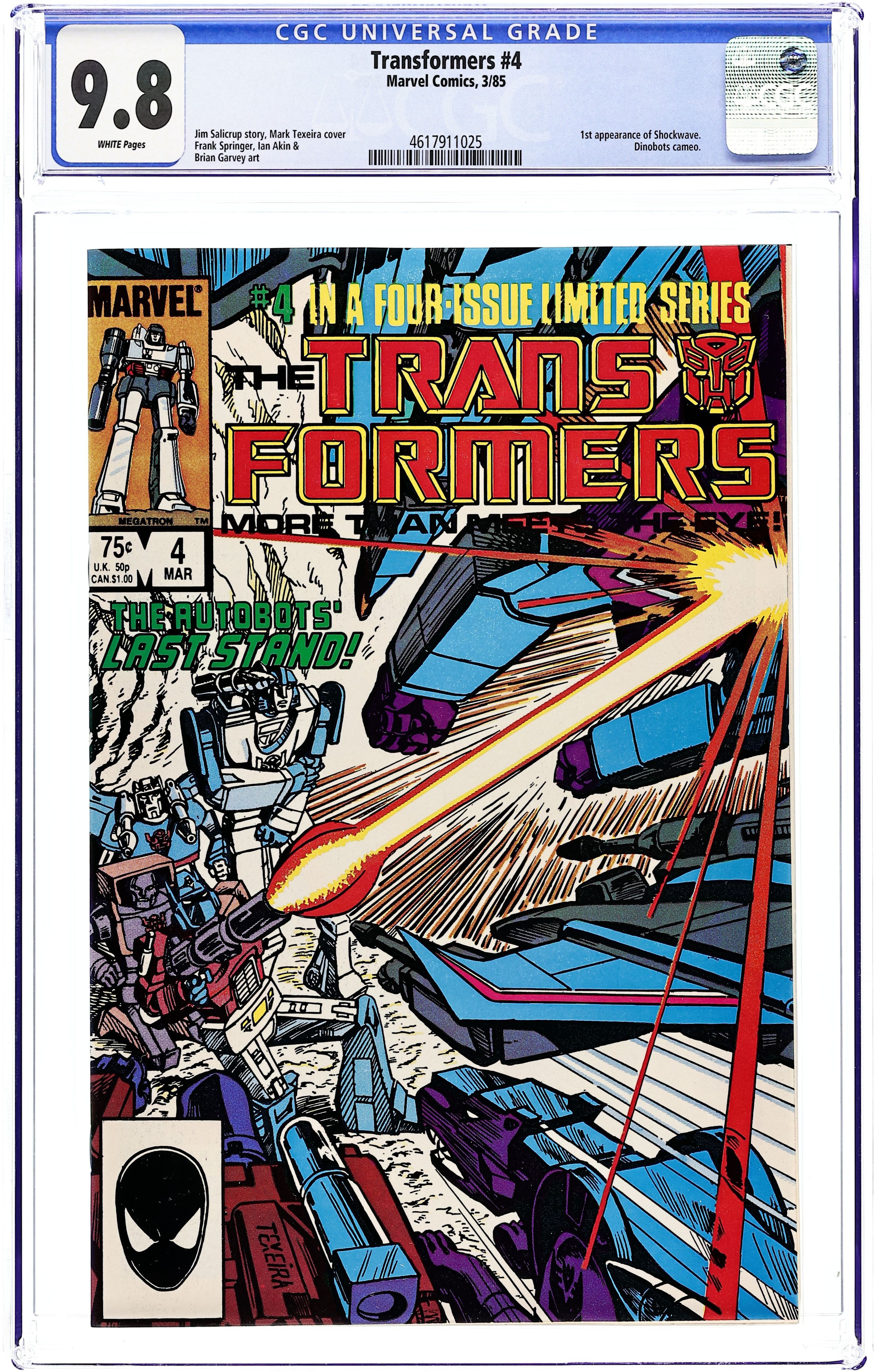 Starts Dec 22 First Printing. Direct Edition. Part 4 of 4. Story by Jim Salicrup. Art by Frank Springer, Ian Akin and Brian Garvey. Cover by Mark Texeira. It's the Autobots' last stand. Low on fuel and out matched, these benevolent Transformers fall before their oppressor rivals, the vile Decepticons. This story's end proves one thing...the good guys don't always win. This is a first printing. All 2nd or 3rd printings have a 2nd, 3rd printing notice on inside at bottom of indicia on first/splash page. 2nd printings were done for most issues from #1 to #9. Cover price $0.75.