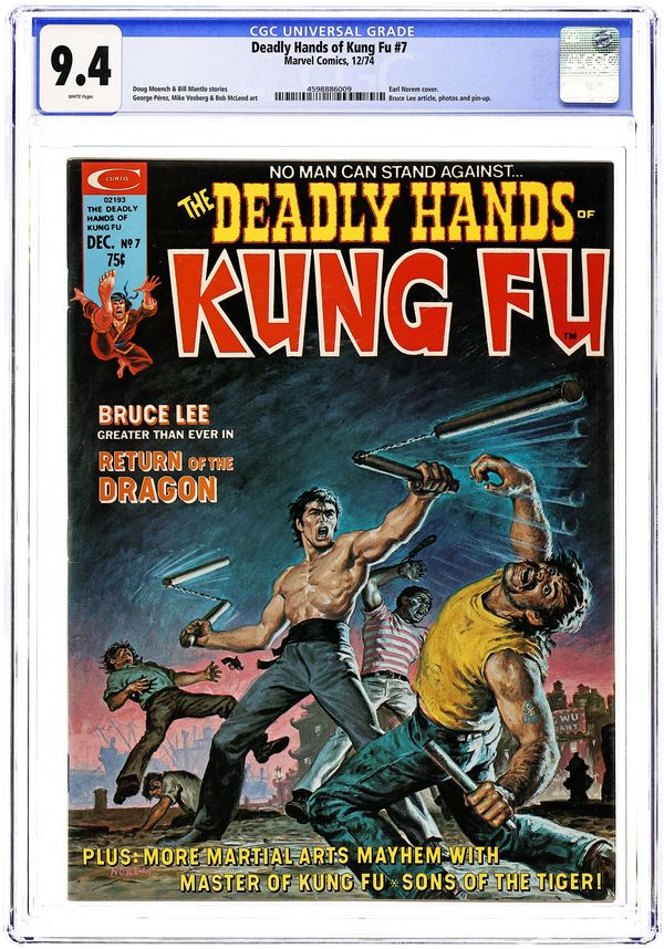 Stan Lee Presents: The Deadly Hands of Kung Fu. Cover by Earl Norem. Includes: Shang Chi, the Master of Kung Fu, stars in "The Past-Assassins!" Story by Doug Moench. Art by Mike Vosburg and Al Milgrom. "Enter the Letters!" A letters page with readers' thoughts on issue #4 (again), and a readers' poll. "The Way of the Dragon vs. the Mass-Sell Menace!" An in-depth article on the Bruce Lee movie Return of the Dragon, co-starring Chuck Norris, by Don McGregor. "The Basic Technique of Blocking!" A 3-page instructional on the fundamentals of martial arts. Plus, the Sons of the Tiger star in "Tigers in a Mind-Cage!" Story by Bill Mantlo. Art by George Perez and Bob McLeod. Includes a poster of Bruce Lee. Black and white. Cover price $0.75.