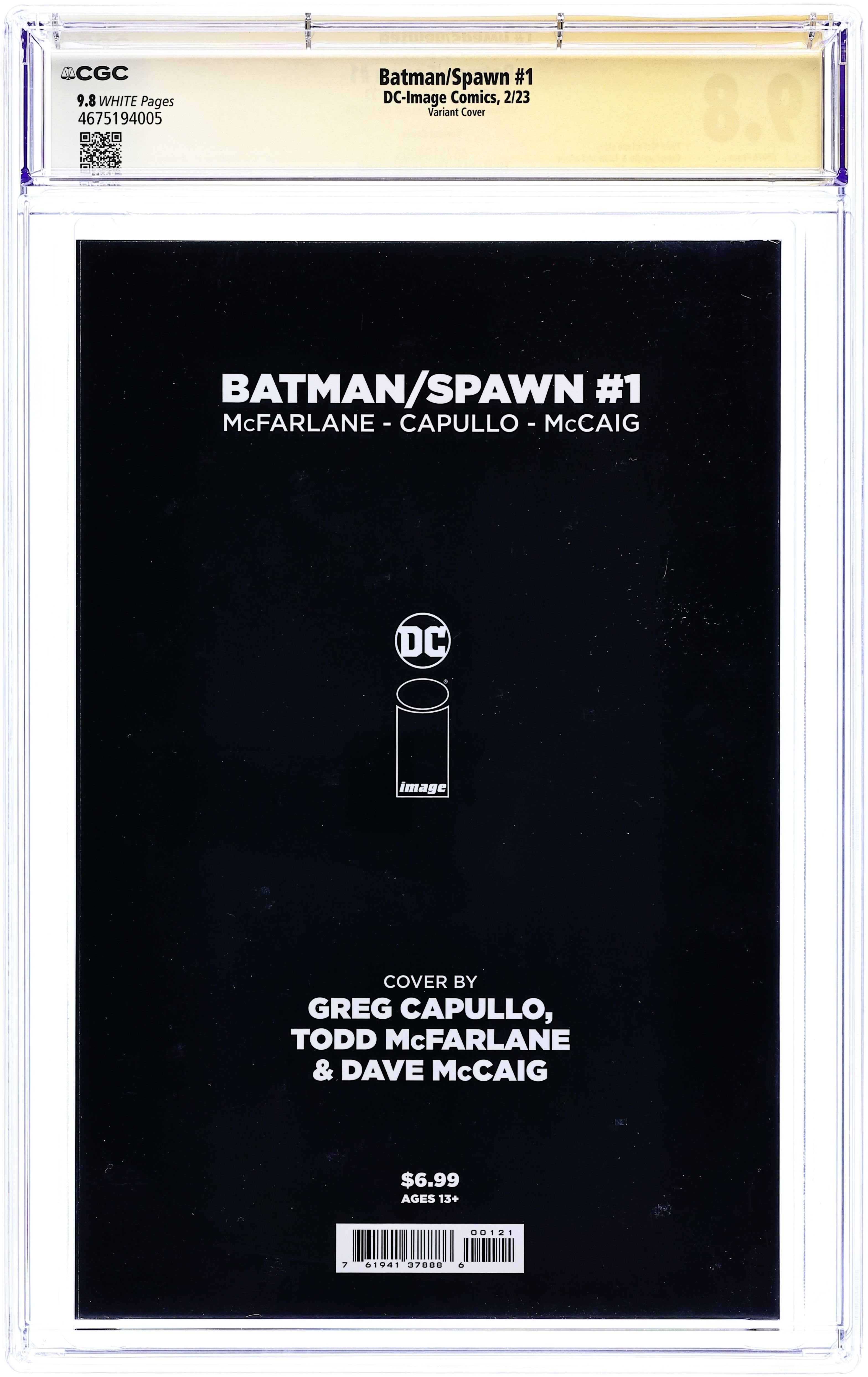 Written by Todd McFarlane. Art by Greg Capullo. Cover by Greg Capullo, Todd McFarlane. Two dark heroes, cursed by tragedy, find their paths again crossing...but not by choice! What sinister foe is at work, pitting the Dark Knight against the Hellspawn? From the shadows of Gotham City to New York City, this epic event is the blockbuster you've been waiting almost two decades for! 48 pages, full color. Rated Teen Cover price $7.99.