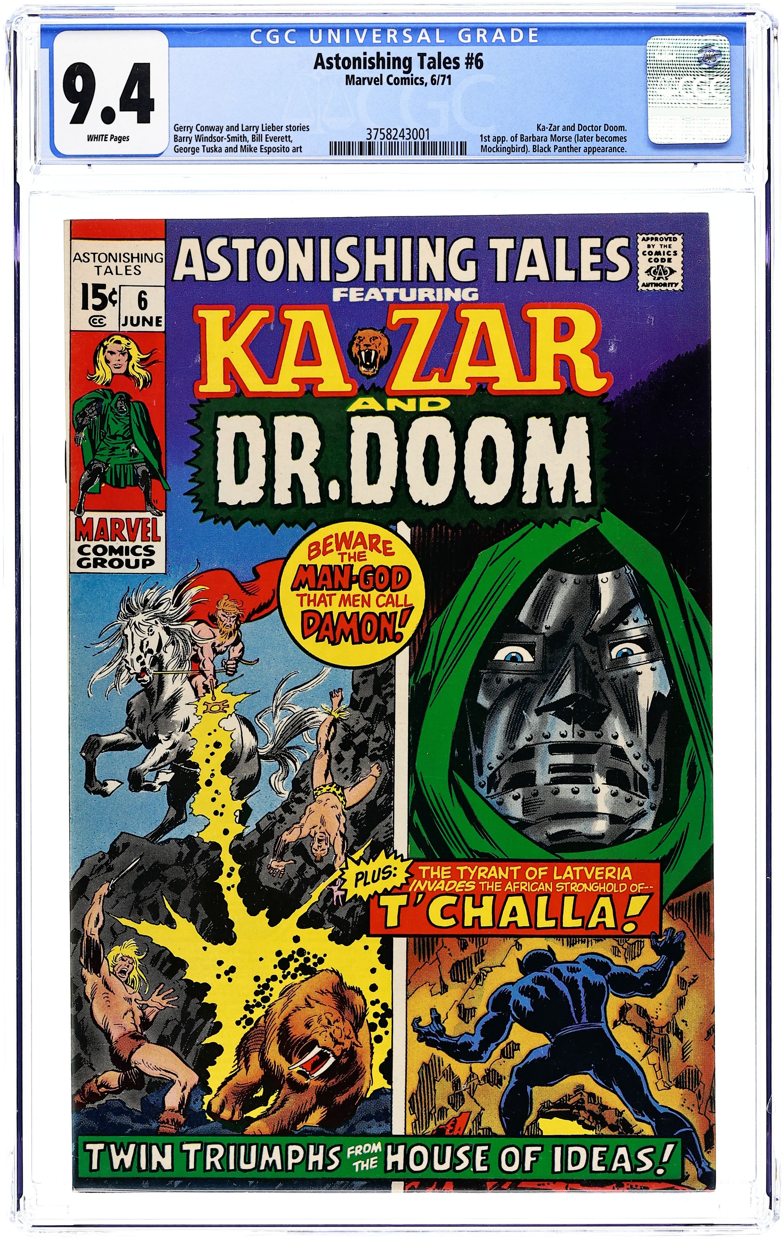 1st Appearance of Bobbi Morse (she later becomes Mockingbird) - Cover pencils by John Buscema, inks by Frank Giacoia. 'Ware the Winds of Death, script by Gerry Conway, pencils by Barry Windsor-Smith [as Barry Smith], inks by Bill Everett; Introduction of Damon the Man-God and his subsequent attack on the Savage Land; Also introduces Bobbi Morse and Tongah's sister and brother, Tatia and Emuel. Advertisement for posters of Fantastic Four, the Black Knight, Silver Surfer and Galactus, and Thor, with a subscription to Marvelmania also included. The Tentacles of the Tyrant!, script by Larry Lieber, pencils by George Tuska, inks by Mike Esposito; Dr. Doom travels to Wakanda to steal Vibranium. Stan Lee's Soapbox. 32 pgs. $0.15. Cover price $0.15.