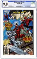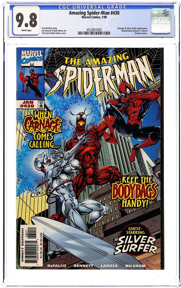 Direct Edition. Cover pencils by Tom Lyle, inks by Bud LaRosa. Carnage and the Silver Surfer guest star in "Savage Rebirth!", script by Tom DeFalco, pencils by Joe Bennett, inks by Bud LaRosa; Spider-Man rejoices that the Avengers have been confirmed to be alive; He begins dealing with the one million dollar reward the Bugle has on him; He heads toward the Baxter Building to visit the Fantastic Four, only to remember that the Thunder Bolts recently purchased the building; Peter agrees to quit being Spider-Man, as Mary meets up with Jill; Dr. Ashley Kafka, the new director of the Ravencroft Institute wants to shut down the microwave field holding back Cletus Kasady in order to cut costs. Cameos by Captain America, Iron Man, and the Vision. 38 pgs., full color. $1.99. Cover price $1.99.