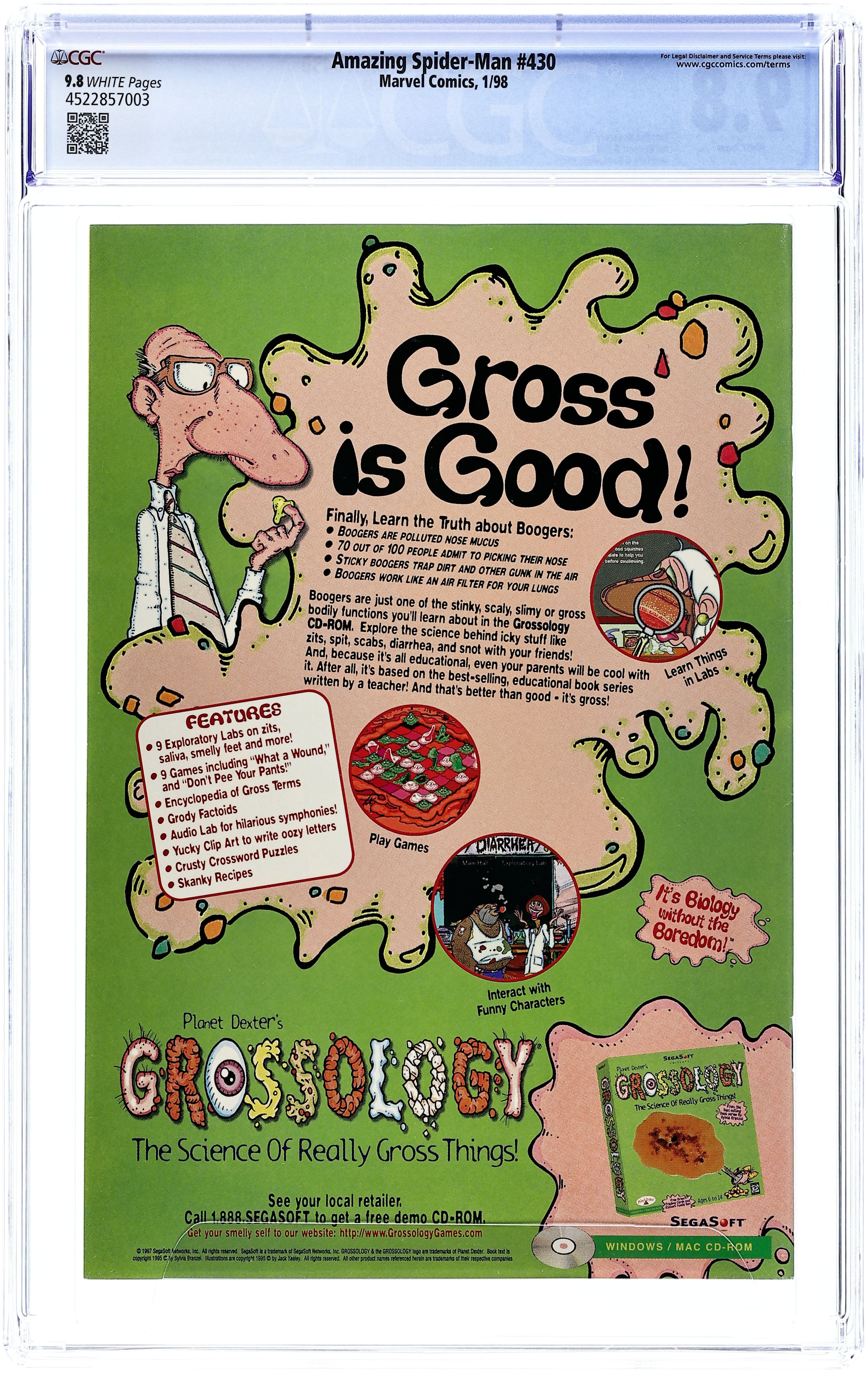Cover pencils by Tom Lyle, inks by Bud LaRosa. "The Carnage Cosmic," script by Tom DeFalco, pencils by Joe Bennett, inks by Bud LaRosa; Silver Surfer takes to space to fight the symbiote without harming innocents, leaving Spider-Man to assist the helpless Cletus Kasady; Martha Robertson is treated for her arm wound and condemns Robbie for thinking like a newsman instead of a concerned husband; Spidey brings Cletus to the same hospital, where it's discovered the symbiote was keeping his stomach cancer at bay; Escaping police capture and bystanders trying to collect the Bugle's bounty, Spidey decides to let the world deal with a symbiote-possessed Surfer without him until he sees the Surfer heading towards the hospital to restore the symbiote to Kasady; Spidey tries to stop him until Surfer convinces him otherwise; Carnage is restored, but the Surfer encases him in an ethereal energy shell so he can't harm anyone. Later, at the Bugle, Robbie hands Jonah his resignation. Galactus cameo. 38 pgs., full color. $1.99. Cover price $1.99.