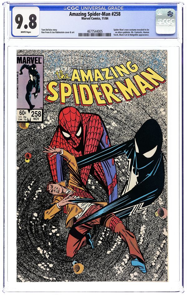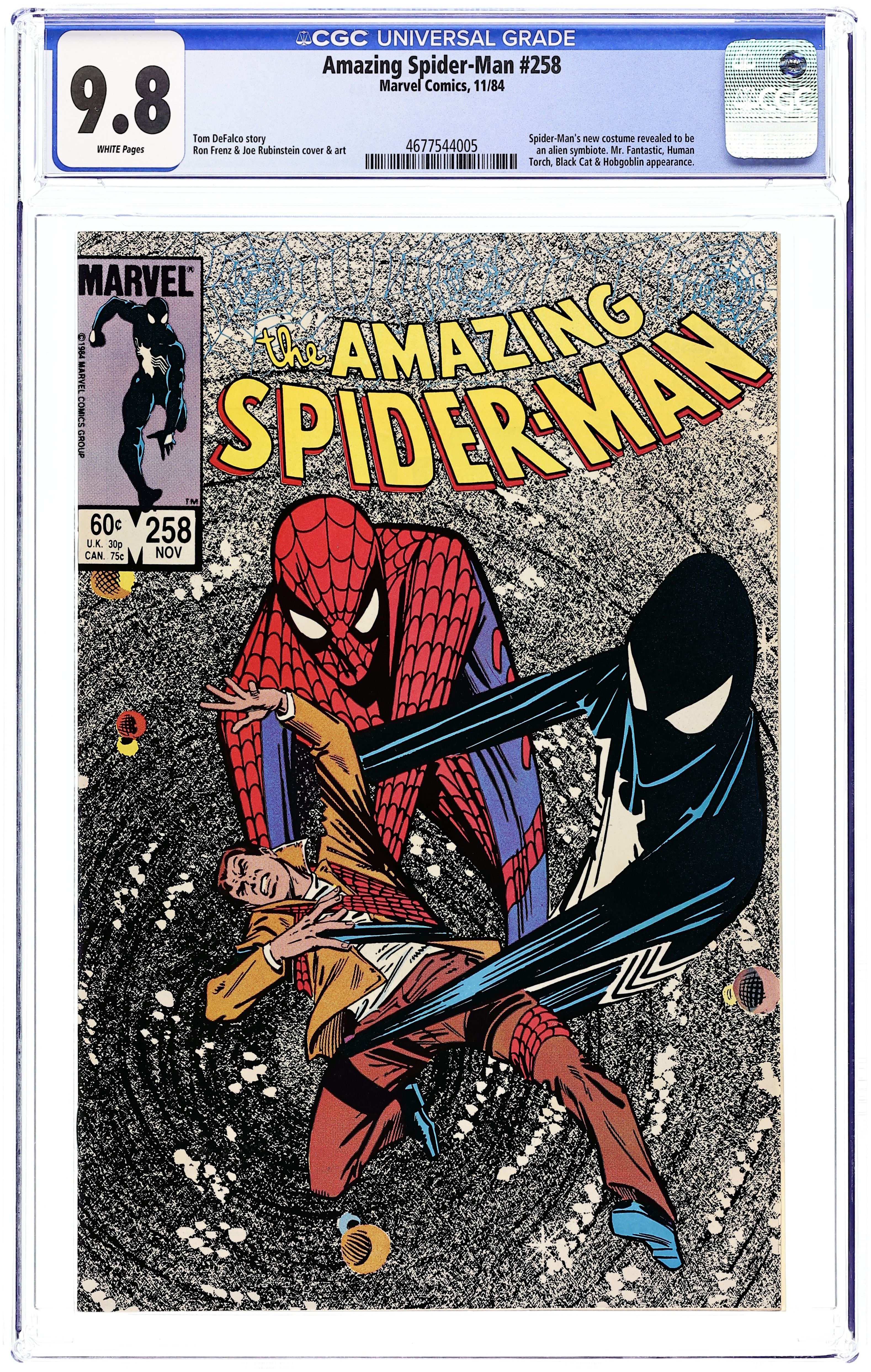 Direct Edition. "The Sinister Secret of Spider-Man's New Costume!" Guest-starring Mr. Fantastic and the Human Torch. Script by Tom DeFalco. Pencils by Ron Frenz. Inks by Joe Rubinstein. Cover by Ron Frenz and Joe Rubinstein. Chaos erupts at 410 Chelsea when Mary Jane Watson and the Black Cat meet inside Peter Parker's apartment! Wow, what a shocking development! To say that the web-slinger has some explaining to do...would be the understatement of the year! After the dust settles, the wall-crawler swings over to the Baxter Building to let Reed Richards analyze his new black costume. When Spider-Man learns his costume is "alive," he tries to pull it off; but the alien symbiote has other ideas! Can the Fantastic Four help Spidey with his major wardrobe malfunction? Cameo appearances by the Rose, Hobgoblin, and Puma. (Notes: The Black Cat and Mary Jane Watson are formally introduced to one another in Spectacular Spider-Man 123. The cover does not display the typical UPC box in the lower left-hand corner. This issue was reprinted in Marvel Tales 272.) 36 pages. Cover price $0.60.