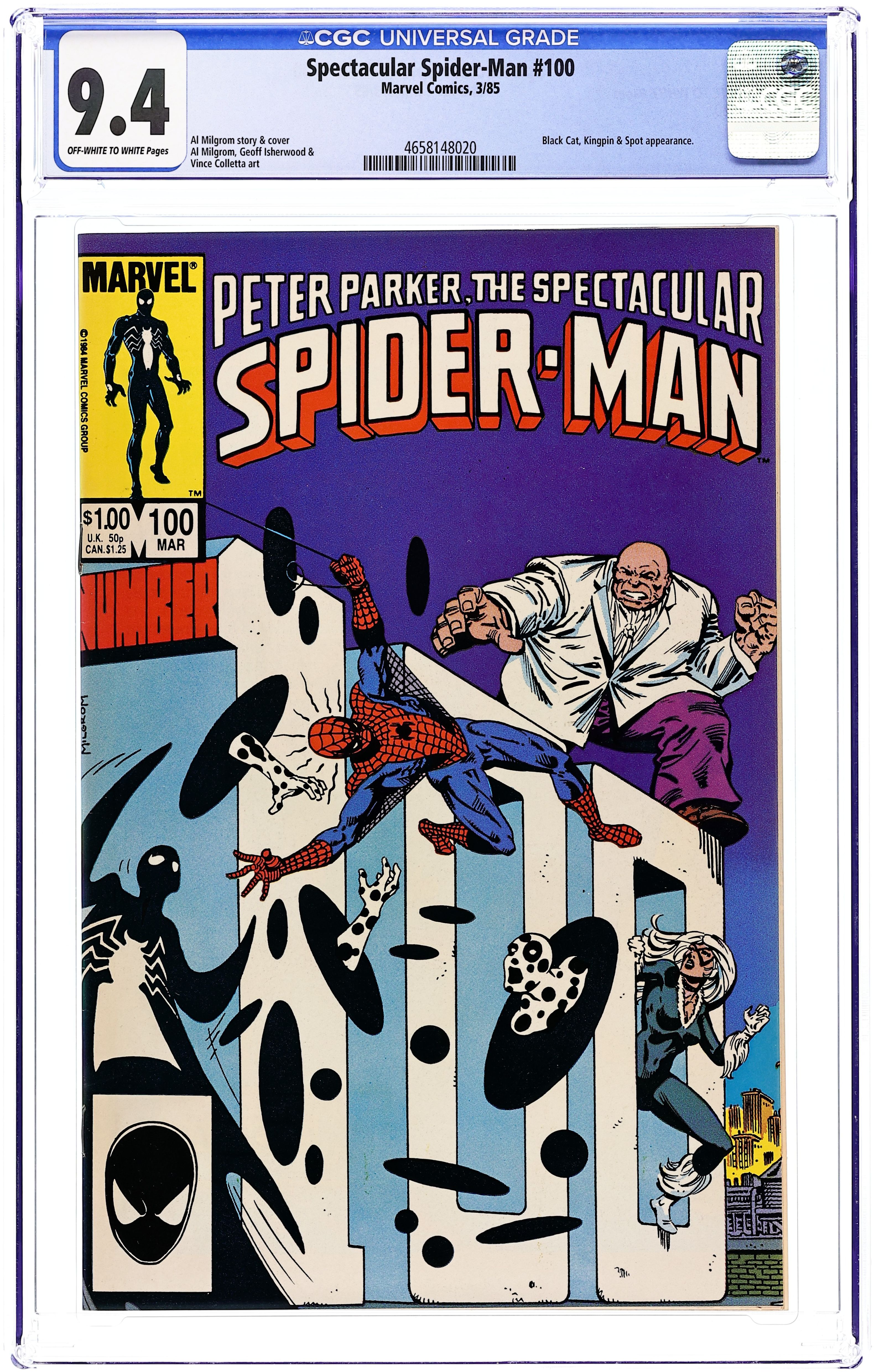 Direct Edition. "Breakin'!" Double-sized issue. Script and Pencils by Al Milgrom. Inks by Vince Colletta and Geof Isherwood. Cover by Al Milgrom. The wall-crawler returns to the Kingpin's skyscraper, but again runs into the pesky Spot! While Spider-Man fights the Spot, the Black Cat confronts the Kingpin and learns the tragic secret of her bad luck powers. A dejected Felicia elects not to attack the massive crime boss, but a few minutes later...the Spectacular Spider-Man does! It's a great slugfest between the Kingpin and the web-slinger! Meanwhile, as the battle is raging at the Kingpin's tower, the alien symbiote slips into Peter Parker's closet...and waits! (Note: The alien symbiote plot line continues in Web of Spider-Man 1.) 48 pages Cover price $1.00.