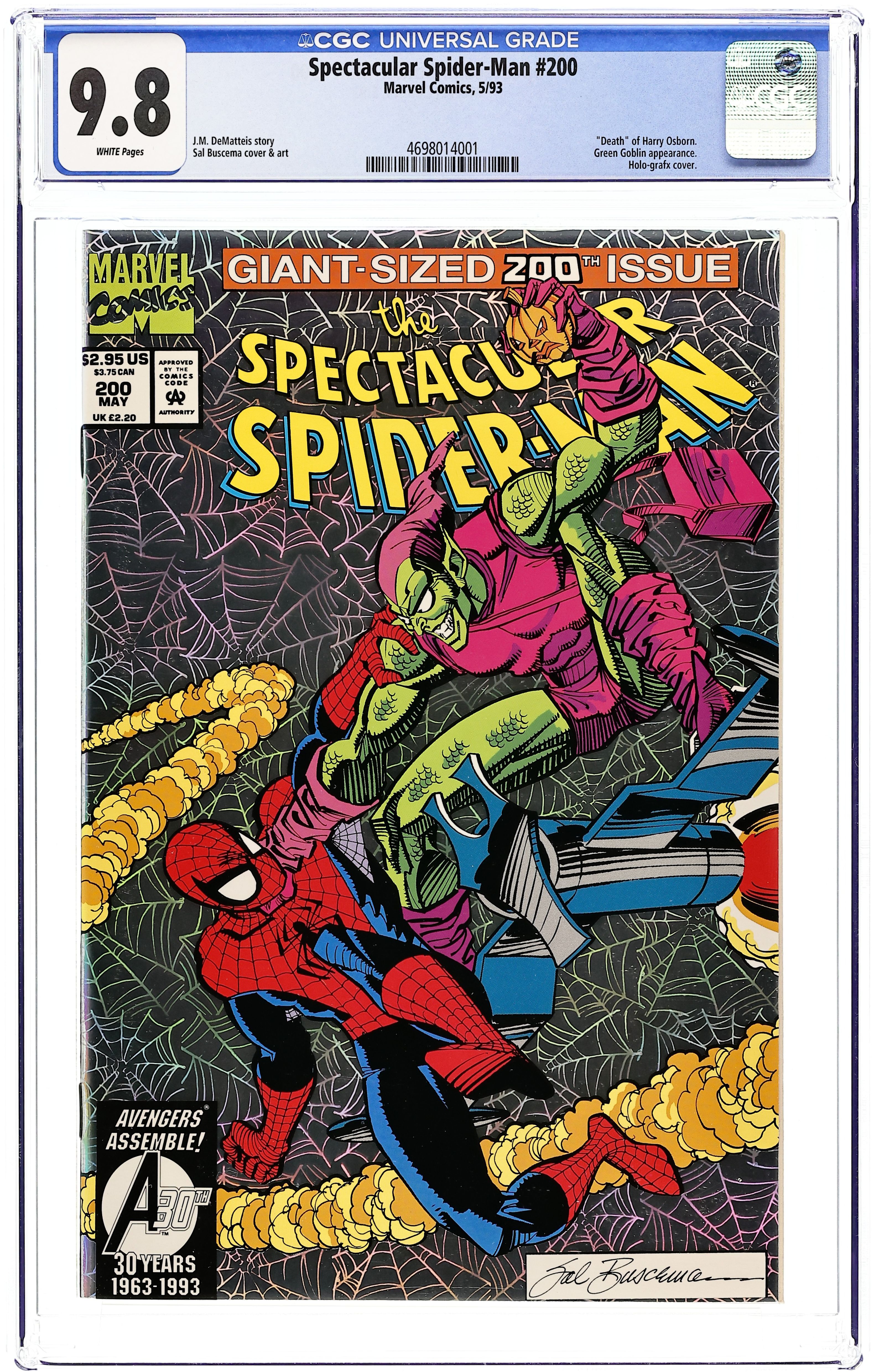 Direct Edition. "Best of Enemies!" Giant-Sized Anniversary Issue. Silver foil cover. Script by J.M. DeMatteis. Pencils and Inks by Sal Buscema. Cover by Sal Buscema. The Green Goblin is on the loose again! And the first thing he does is grab Mary Jane and take her to the top of the Brooklyn Bridge! Oh no! Is the tragic history from Amazing Spider-Man 121 going to repeat itself?! Thankfully not this time as Mary Jane talks sense into the goblin! But Harry's mental state continues to fluctuate between lucidity and lunacy. And his hatred for the web-slinger grows by the day! When will the goblin strike again? The untenable situation has Peter and Mary Jane living on the edge…waiting for the next attack! The fateful day of destiny finally arrives when Harry traps Spider-Man inside his townhouse wired with explosives! The goblin is poised to administer the coup de grâce when he suddenly realizes that little Normie and Mary Jane have just entered the building! And now the wall-crawler's long-time foe (and Peter Parker's long-time friend) faces a series of critical decisions! Save his son? Save Mary Jane? Save Spider-Man? What will the Green Goblin do with three lives on the line? Will years of friendship or years of frustration guide Harry's choices? A heartbreaking ending. Death of Harry Osborn. An unknown percentage of the print run was produced with the foil design misaligned. We do not differentiate between the two, but any slabbed copies listed here with misaligned foil noted on the label will have that notation in our listings as well. 48 pages. Cover price $2.95.