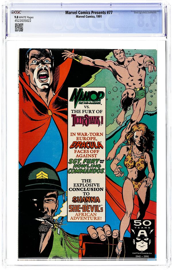 Direct Edition. Cover art by Barry Windsor-Smith. Weapon X (chapter 5), script and art by Barry Windsor-Smith. A Place In the Wilderness (The Bush of Ghosts part 10) starring Shanna the She-Devil, script by Gerard Jones, pencils by Paul Gulacy, inks by Gary Martin. Rude Awakening (Rumanian Rumble part 1) starring Sgt. Fury and Dracula, script by Doug Murray, pencils by Tom Lyle, inks by Joe Rubinstein and Art Nichols. The Tides That Bind starring The Sub-Mariner, script and inks by Robert Campanella, pencils by Grant Miehm. 36 pgs. Cover price $1.25.
