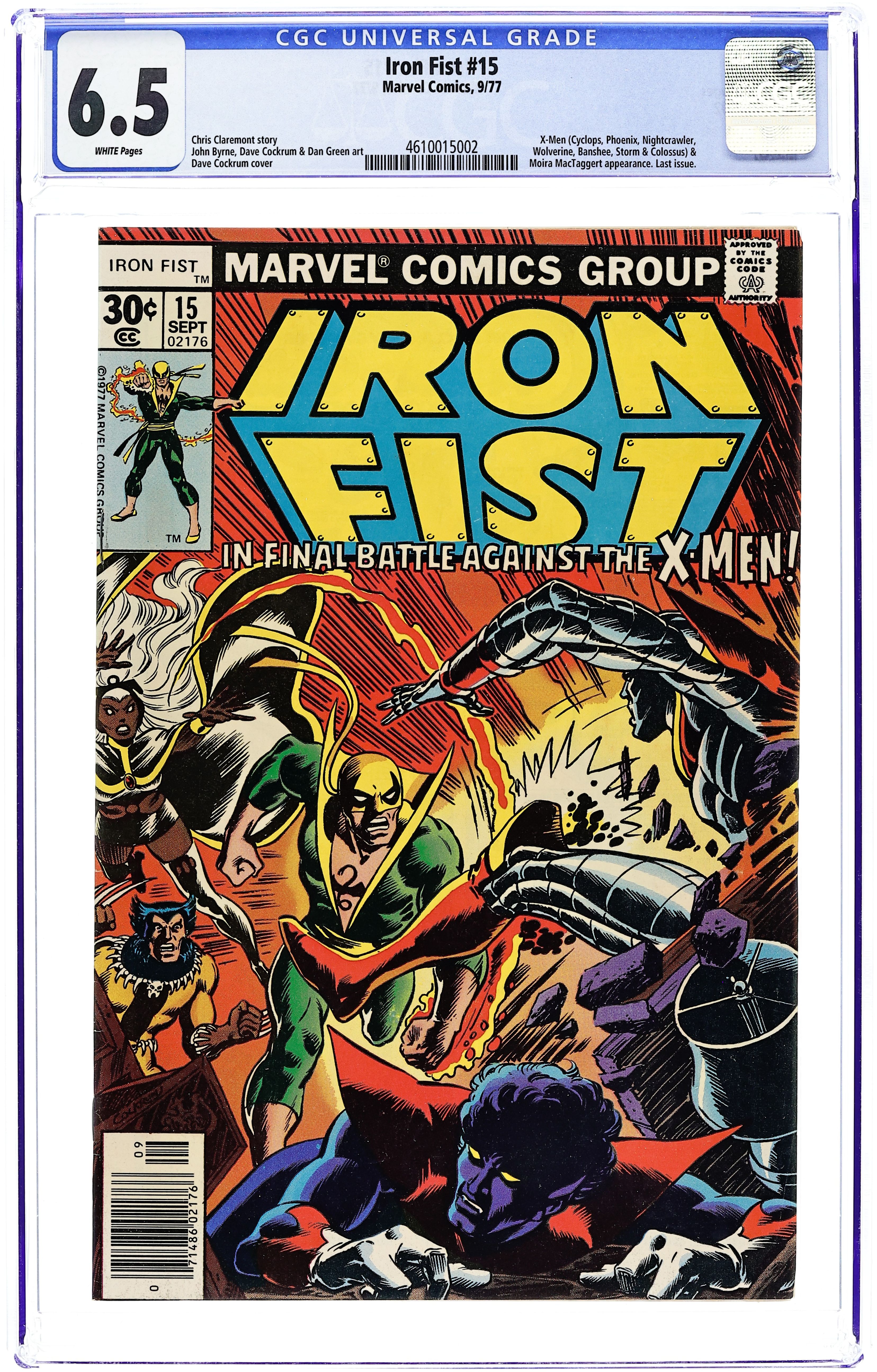 Final issue. 1st appearance of Bush Master. "Enter the X-Men!" Guest-starring the Uncanny X-Men and Misty Knight. Story by Chris Claremont. Art by John Byrne and Dan Green. Cover by Dave Cockrum. Danny arrives at Misty Knight's apartment to find his friend missing However, this apartment also belongs to one Jean Grey, and a misunderstanding has Iron Fist in pitch battle against the Uncanny X-Men. Meanwhile, Misty Knight is deep undercover infiltrating the organization of none other than Bush Master (Power Man's erstwhile foe)! The subplot of the dragon branded bruiser that has ambushed Iron Fist is wrapped up in Marvel Team-up #63-64, and Iron Fist's further adventures continues in Power Man and Iron Fist #48. Cover price $0.30.