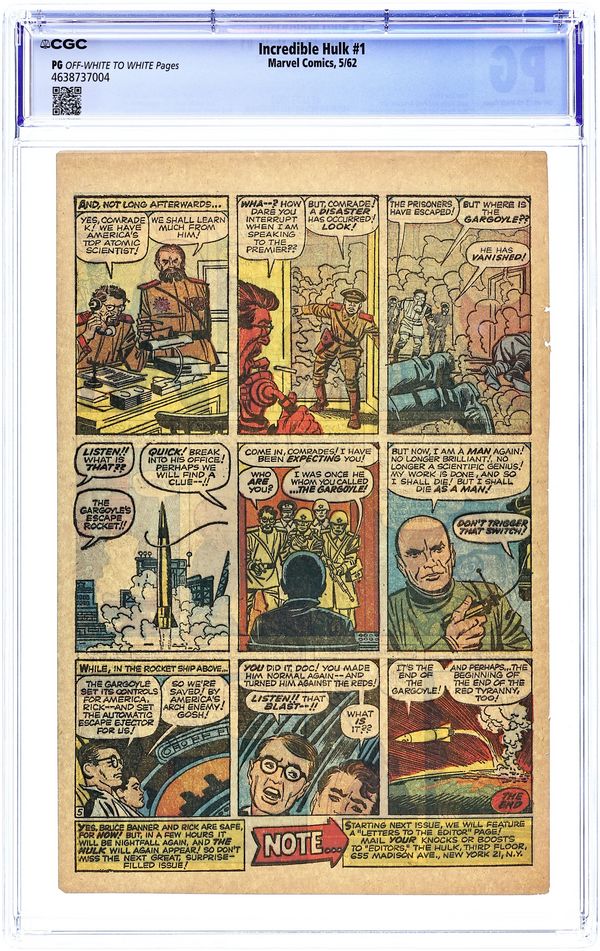 Cover pencils by Jack Kirby, inks by Dick Ayers. "The Monster and the Machine!," script by Stan Lee, pencils by Jack Kirby, inks by Dick Ayers; Rick uses some of Banner's machinery to transform the Hulk, who was stuck in his monster persona, back into Bruce. "The Gladiator from Outer Space!," script by Stan Lee, pencils by Jack Kirby, inks by Dick Ayers; An alien invades Earth and claims his people will conquer the planet unless he is met in battle by the strongest opponent the world has to offer; Hulk meets the challenge but finds out it is all a ploy by the Russians to capture him and create an army of hulks of their own. 36 pgs., full color. $0.12. Cover price $0.12.