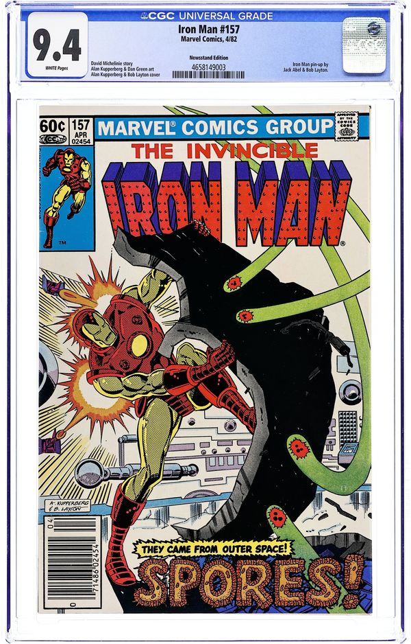 Newsstand Edition. "Spores!" Part 2 of 2. Story by David Michelinie and Alan Kupperberg. Art by Dan Green and Alan Kupperberg. Cover by Bob Layton and Alan Kupperberg. Iron Man is transported to an alien ship in outer space and forced to battle mysterious energy spores. (Notes: This issue includes a one-page pin-up of Iron Man by Jack Abel and Bob Layton. The letters page contains a statement of ownership: average print run 362,541; average paid circulation 177,520.) Cover price $0.60.