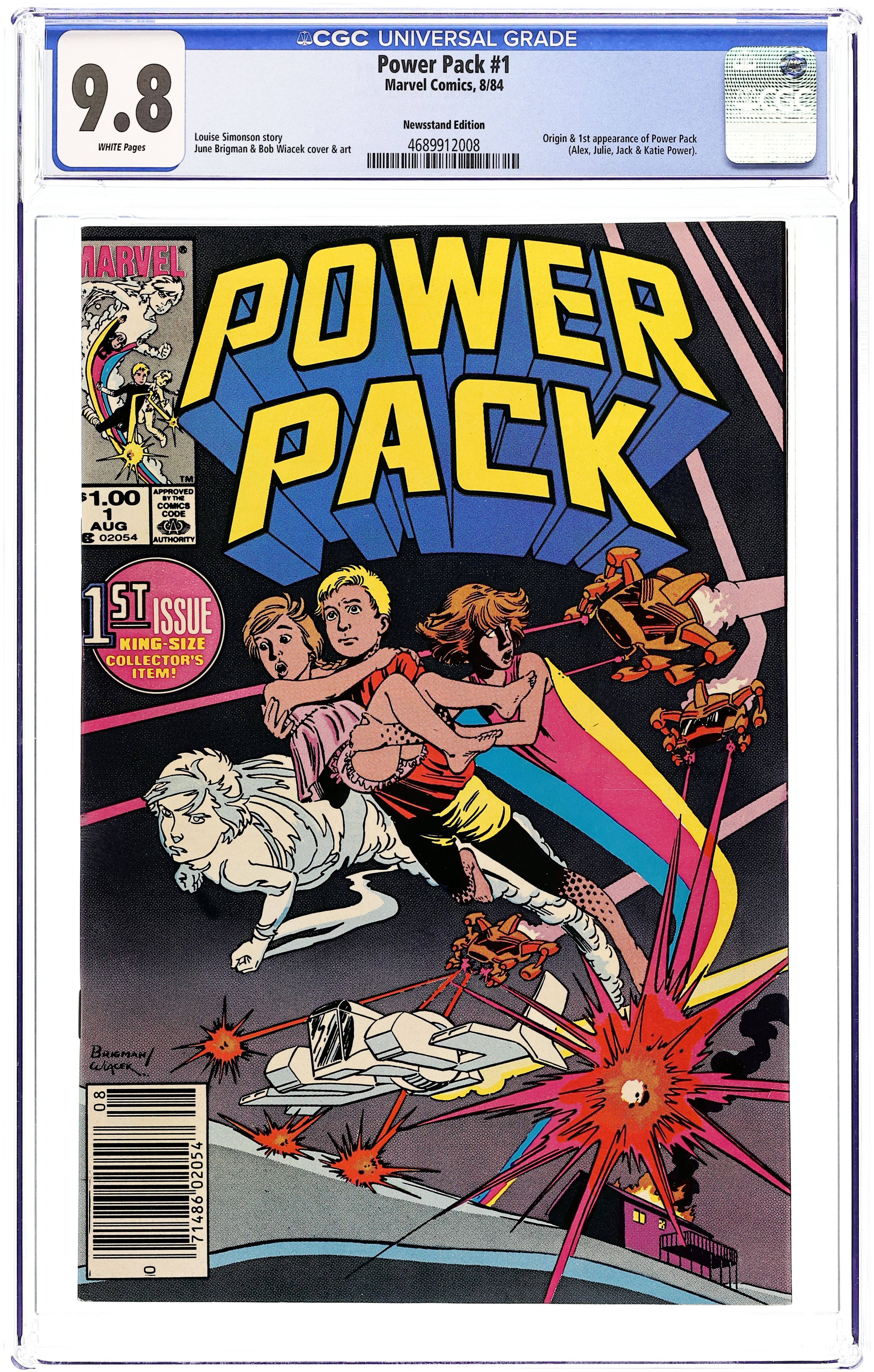 Newsstand Edition. Cover art by June Brigman and Bob Wiacek. Power Play, script by Louise Simonson, pencils by June Brigman, inks by Bob Wiacek; an alien called Whitey, under attack by Snarks, crash lands on Earth and gives super powers to four children. The Power Behind the Pack article, art by Walt Simonson. Origin and 1st appearance of Power Pack. 52-page giant. $1.00. Cover price $1.00.