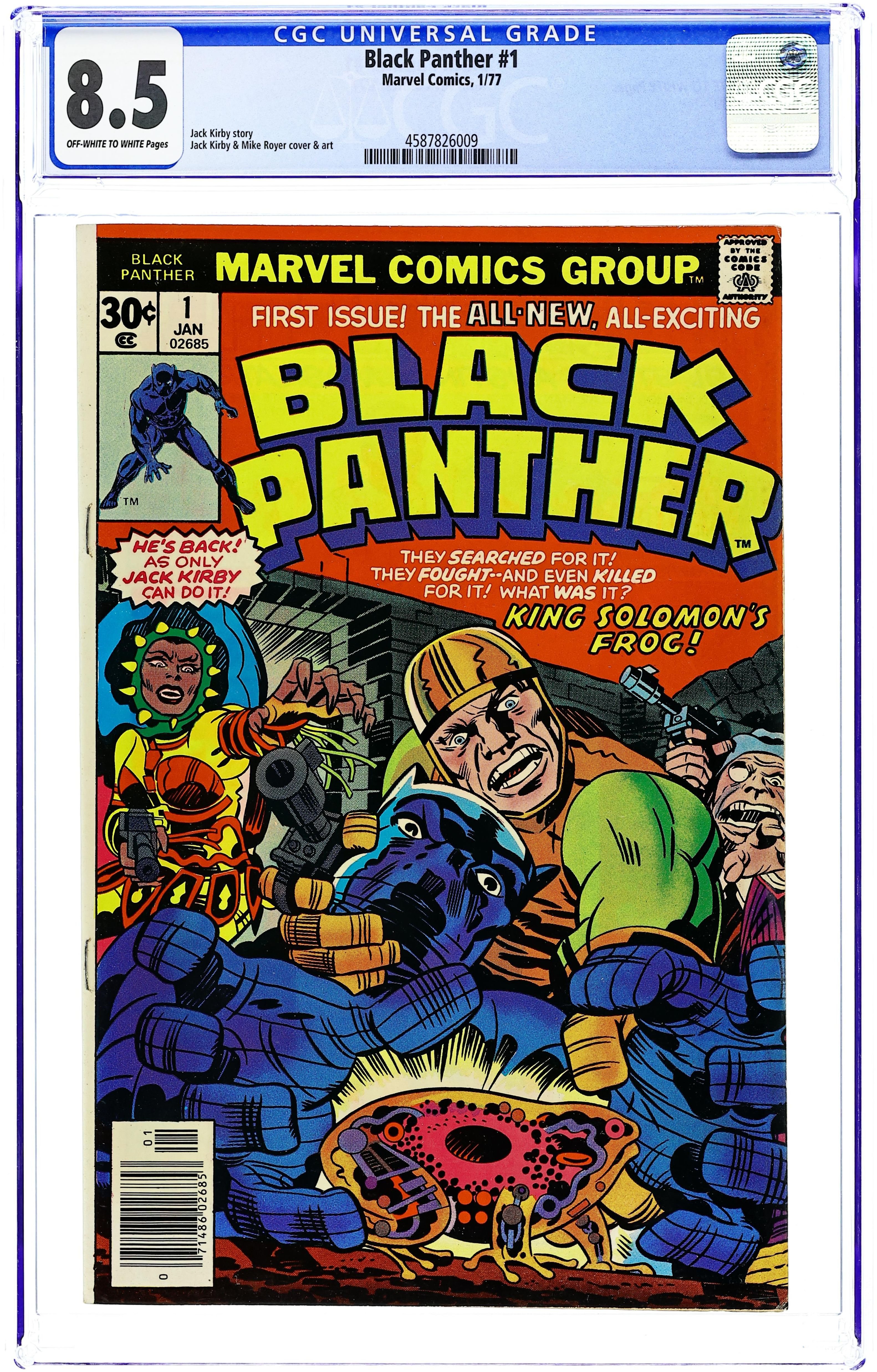 Ends Mar 2 7:41 PM CST Bid History 12 bids Current Bid $78 Your Secret Max Bid If you'd like to bid, please log in or register. Cover pencils by Jack Kirby, inks by John Verpoorten. King Solomon's Frog!, script and pencils by Jack Kirby, inks by Mike Royer; Black Panther helps Abner Little, a member of the Collectors, recover the Brass Frog, an ancient time machine; Due to its dangerous nature, the Frog had previously been hidden away by the Black Panther's grandfather, Azzuri, but was taken by Alfred Queely, a fellow member of the Collectors; After getting the Frog, the Black Panther and Little are attacked by Princess Zanda, another member of the Collectors, for control of the artifact. During the battle, the Frog is activated and a mysterious creature, Hatch-22, appears. Jack Kirby writes about what readers can expect from his new Black Panther. 36 pgs. $0.30. Cover price $0.30.