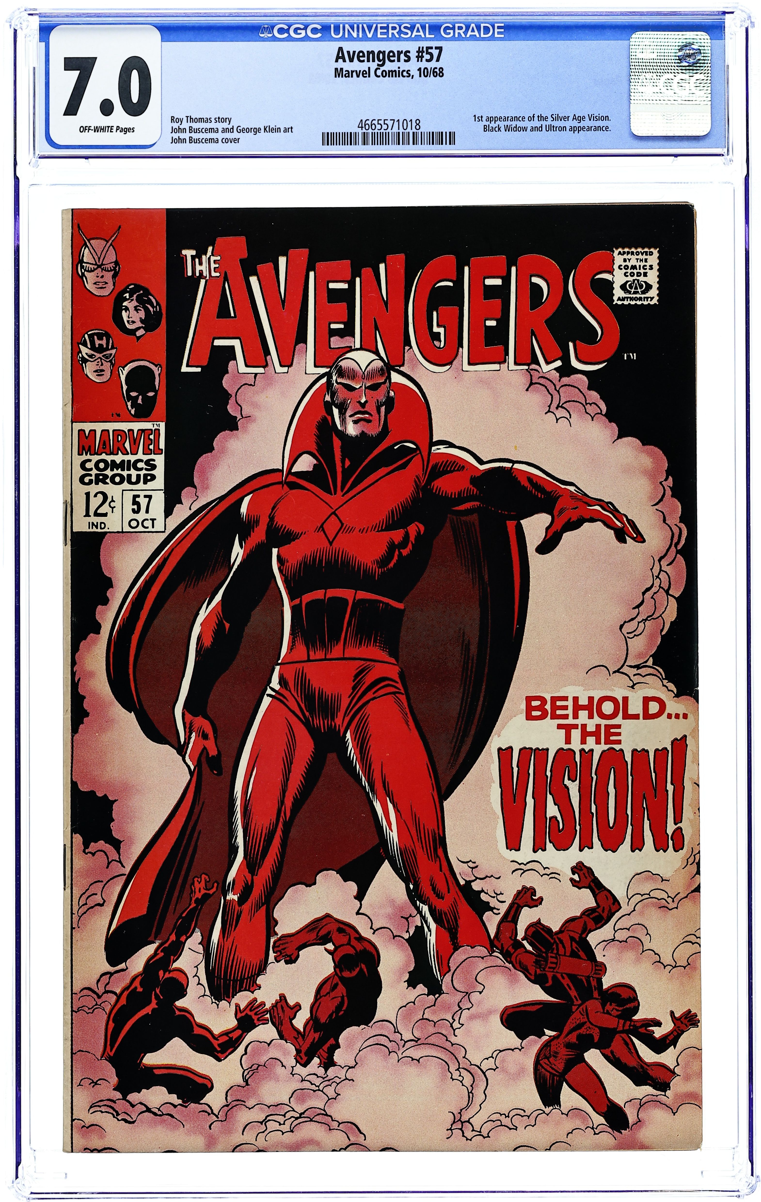 First appearance of the Vision in "Behold...the Vision!" Part 1 of 2. Script by Roy Thomas. Pencils by John Buscema. Inks by George Klein. Cover by John Buscema and George Klein. One of the landmark issues of the silver age! On a rainy night in Manhattan, a strange being enters Janet Van Dyne's apartment and suddenly collapses! The Wasp quickly calls Goliath; and they take the red-hued stranger to Avengers Mansion for examination! Once their Hank Pym discovers that the Vision is a human being constructed of synthetic materials - a synthezoid in fact! When the Vision wakes up, he remembers that Ultron sent him to destroy the Avengers! But now the Vision wants to flip the script on his creator! So he leads Earth's Mightiest Heroes back to Ultron's underground lair! Could this be a trap? Either way Ultron-5 is waiting! And the battle is coming! Will the Vision prove worthy of the Avengers' trust? Cameo appearance by the Black Widow. Avengers Lineup: Black Panther, Goliath, Hawkeye, and the Wasp. (Notes: The synthezoid avenger is not to be confused with the golden age Vision (aka Aarkus). Marie Severin contributed pencils to page 3 - the second to last panel. The letters page includes a letter from comics writer Tony Isabella. This issue was reprinted in Marvel Treasury Edition (1974) #7 and also in Marvel Super Action #18.) 36 pages. Cover price $0.12.
