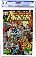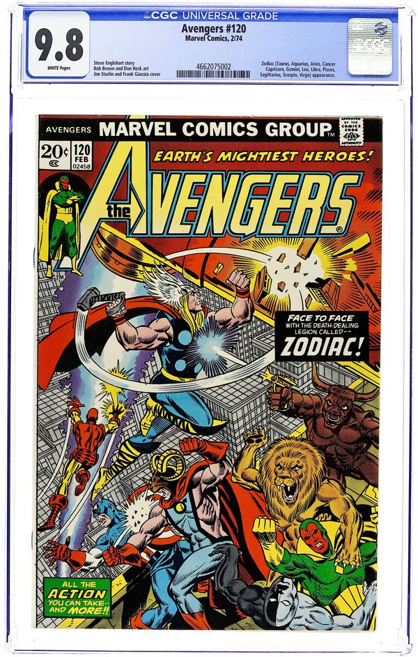"Death-Stars of the Zodiac!" Part 1 of 3. Script by Steve Englehart. Pencils by Bob Brown. Inks by Don Heck. Cover by Jim Starlin and Frank Giacoia. As shown on Jim Starlin's spectacular cover, the Zodiac attacks! Taurus (aka Cornelius Van Lunt) has reformed the 12-member cartel for one express purpose! Destroying the Avengers! In brazen fashion, the super-villains from the stars storm into Avengers Mansion and overwhelm the five avengers inside! After licking their wounds, Earth's Mightiest Heroes discover that Taurus has another diabolical objective on his agenda! Kill every person in Manhattan born under the sign of Gemini! Wow, where did the Zodiac get that kind of power? It doesn't matter now as Taurus' giant star-blaster is set to fire its death-ray from atop the World Trade Center! It's a frantic race against time to save thousands of Gemini! Avengers Assemble! Avengers Lineup: Iron Man, Mantis, Scarlet Witch, Swordsman, Thor, and the Vision. (Note: Captain America is depicted on the cover but does not appear in the story inside.) 36 pages Cover price $0.20.