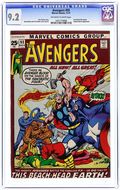 "The Power of Babel!" Guest-starring Captain Marvel. Script by Steve Englehart. Art by John Buscema (breakdowns) and Dave Cockrum (finishes). Cover by Ron Wilson and John Romita. Story continues from Captain Marvel 32. Captain America returns to the Avengers just in time for an out-of-this-world adventure! Earth's Mightiest Heroes blast off into outer space to intercept Thanos' awesome armada headed towards Earth! The Avengers attack the alien starships and inflict heavy damage until they bump into a solid black force field! What's hiding behind the imposing barrier? The Vision, Scarlet Witch, Swordsman, and Mantis penetrate the force field and discover the mad Titan's massive command ship! And hordes of aliens inside! But these are four mighty avengers! With skill and teamwork, they disable the ship's universal translator and throw the entire attack fleet into chaos! Have the Avengers finally derailed Thanos' plan for conquest of the cosmos? Story concludes in Captain Marvel 33. Cameo appearances by Libra, Lou-Ann, Thanos, and the Skrulls. Avengers Lineup: Black Panther, Captain America, Iron Man, Mantis, Scarlet Witch, Swordsman, Thor, and the Vision. (Note: The letters page contains Marvel Value Stamp Series A #69 Marvel Girl.) 36 pages Cover price $0.25.