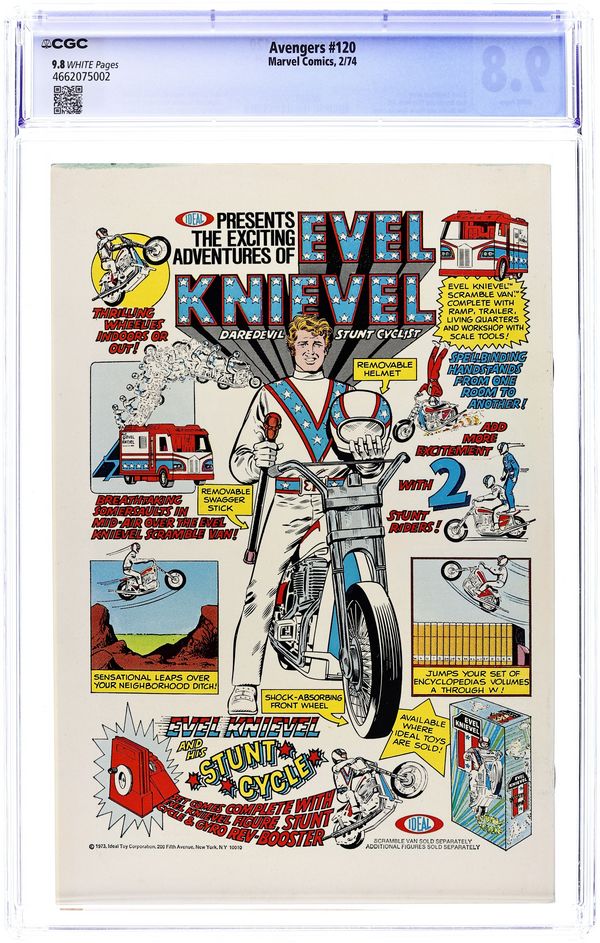 "Night of the Collector" Script by Steve Englehart. Pencils by Bob Brown. Inks by Don Heck. Cover by John Romita. The Avengers' cataclysmic confrontation with Dormammu is over, and now the team is ready for rest and relaxation. To that end Earth's Mightiest Heroes participate in the Halloween parade in Rutland, Vermont! However, an old acquaintance with a penchant for collecting super-heroes is also present in the Green Mountain State on this all hallows eve! The ancient elder's plan gets off to a good start as the golden avenger, shield-slinger, thunder god, and panther fall before his arcane might! But four avengers remain on the loose! And with help from the local townsfolk, the four heroes will attempt to corral the Collector! Cameo appearances by Loki and Tom Fagan. Avengers Lineup: Black Panther, Captain America, Iron Man, Mantis, Scarlet Witch, Swordsman, Thor, and the Vision. (Notes: The Collector previously appeared in Iron Man (1st series) 26 and returns in Incredible Hulk 197. The Avengers also attended the Rutland parade in Avengers 83.) 36 pages Cover price $0.20.