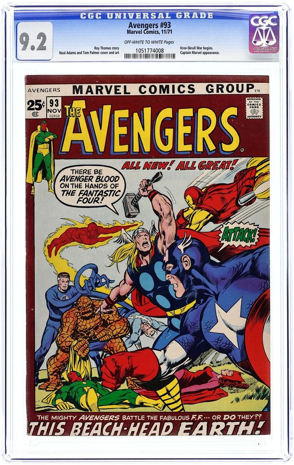 Starts Feb 2 "This Beachhead Earth" Part 5 of 9. Double-sized issue. Guest-starring Captain Marvel. Script by Roy Thomas. Pencils by Neal Adams. Inks by Tom Palmer. Cover by Neal Adams and Tom Palmer. One of the iconic issues of the Avengers! The acclaimed Kree/Skrull War kicks into high gear with the brilliant pencils of Neal Adams! After leaving Avengers Mansion in shame; Quicksilver, Goliath, Rick Jones, the Scarlet Witch, and the Vision trek to upstate New York to check on the safety of Captain Marvel. But before they can reach the safe house, the Fantastic Four (or some alien race mimicking their powers) attacks! In the chaotic battle that follows, Wanda and Pietro are captured and the Vision is badly injured! With his synthetic body failing, the Vision limps back to the mansion! And once inside (and as famously illustrated), the astonishing Ant-Man takes a perilous journey to the center of the android! Can Hank Pym revive the synthezoid avenger? And get Earth's Mightiest Heroes back into the intergalactic free-for-all? Appearances by Rick Jones and the Super-Skrull. Avengers Lineup: Ant-Man, Captain America, Goliath, Iron Man, Quicksilver, Scarlet Witch, Thor, and the Vision. Cover price 25¢. (Notes: The Vision becomes a mainstay next to the Avengers cover logo thru issue 184. Possible cover alterations made by Marie Severin. The second half of the Kree/Skrull War (issues 93-97) was reprinted in 1983 in the two-issue special edition: The Kree-Skrull War starring the Avengers.) 52 pages. Cover price $0.25.