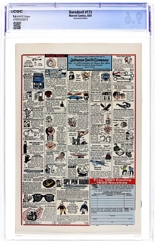 Newsstand Edition. Cover pencils by Frank Miller, inks by Klaus Janson. Last Hand, script by Frank Miller, pencils by Frank Miller (breakdowns) and Klaus Janson (finished art), inks by Klaus Janson; Bullseye breaks out of prison; Elektra hunts down Foggy and is about to kill him until she recognizes him as Matt's buddy from college; Bullseye fights Elektra and kills her with her own sai; DD goes after Bullseye and ends up dropping him from a great height, breaking every bone in his body; Kingpin appearance; story narrated by Bullseye; story dedicated to the memory of Wally Wood 1927-1981. Full page pin-up ad for Marvel Fanfare, art by Michael Golden. Statement of Ownership average # of copies in preceding 12 months: 276,812. 36 pgs. Cover price $1.00.