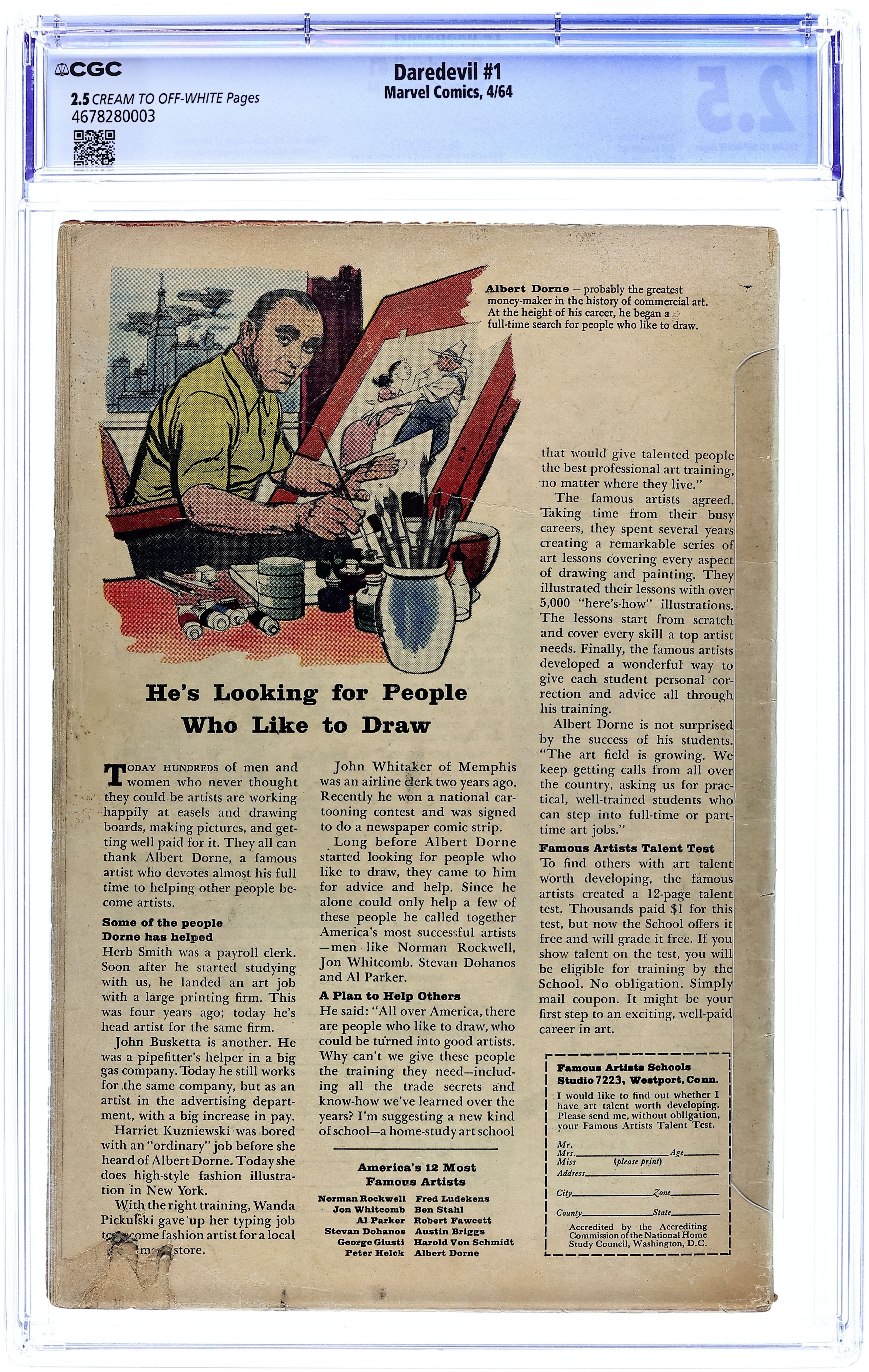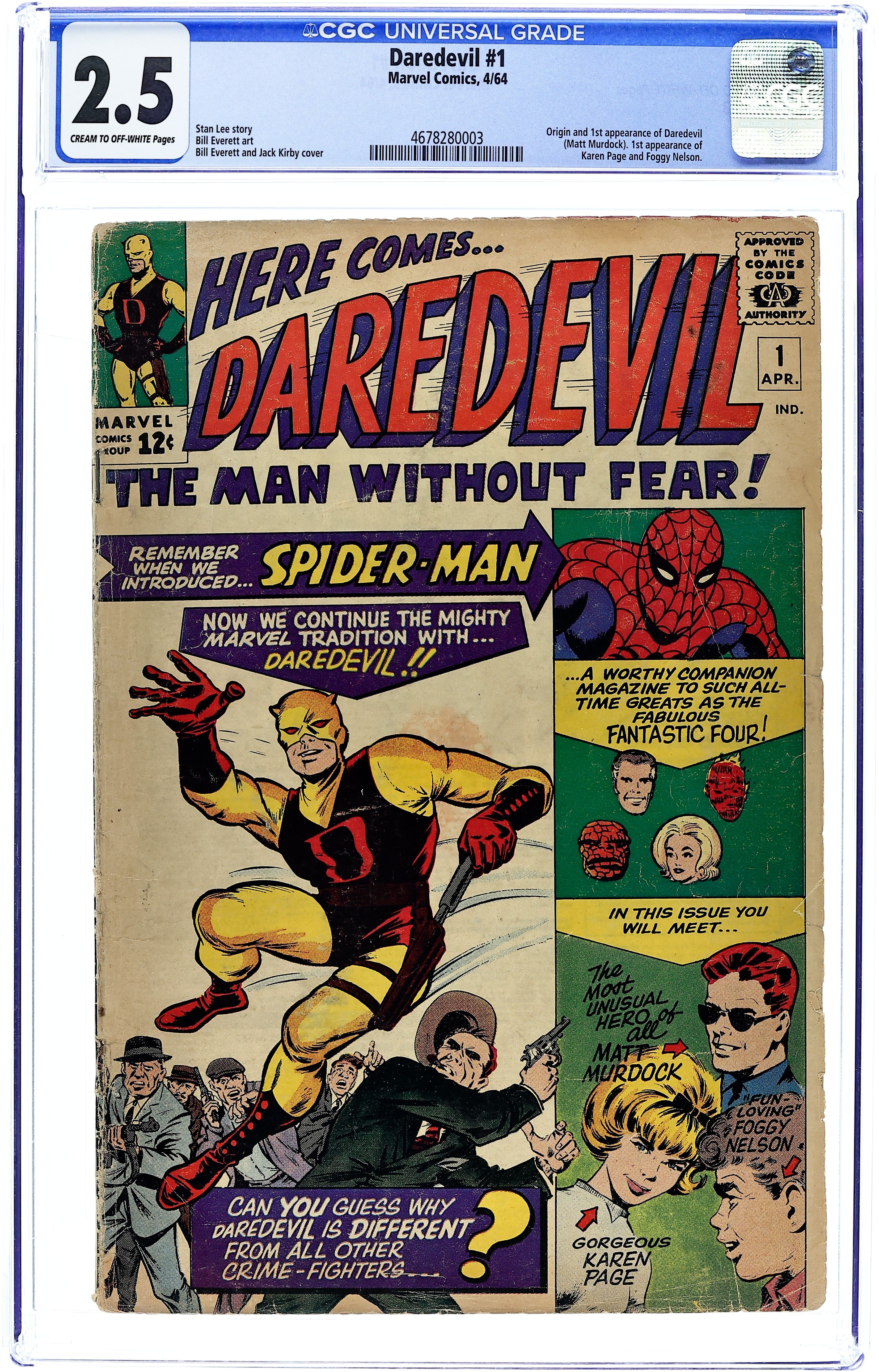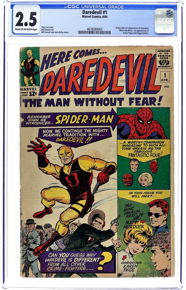 Cover pencils by Jack Kirby, inks by Bill Everett. First appearances of Daredevil, Karen Page, and Foggy Nelson in The Origin of Daredevil, script by Stan Lee, art by Bill Everett (splash page penciled by Jack Kirby); Matt Murdock saves a blind man from an oncoming truck but is struck blind himself by a radioactive canister during the rescue; The radioactivity heightens Matt's other senses and gives him an uncanny radar sense; Matt graduates college and begins practicing law with his college roommate Foggy; Matt's father, a boxer, is killed by the Fixer after he refuses to throw a fight; Matt designs a costume and a billy club (from his cane) and takes his derogatory childhood nickname "Daredevil"; DD tracks down the Fixer and the man who shot his father. Spider-Man and Fantastic Four appear on the cover but not in the story inside. 36 pgs. Cover price $0.12. Cover price $0.12.