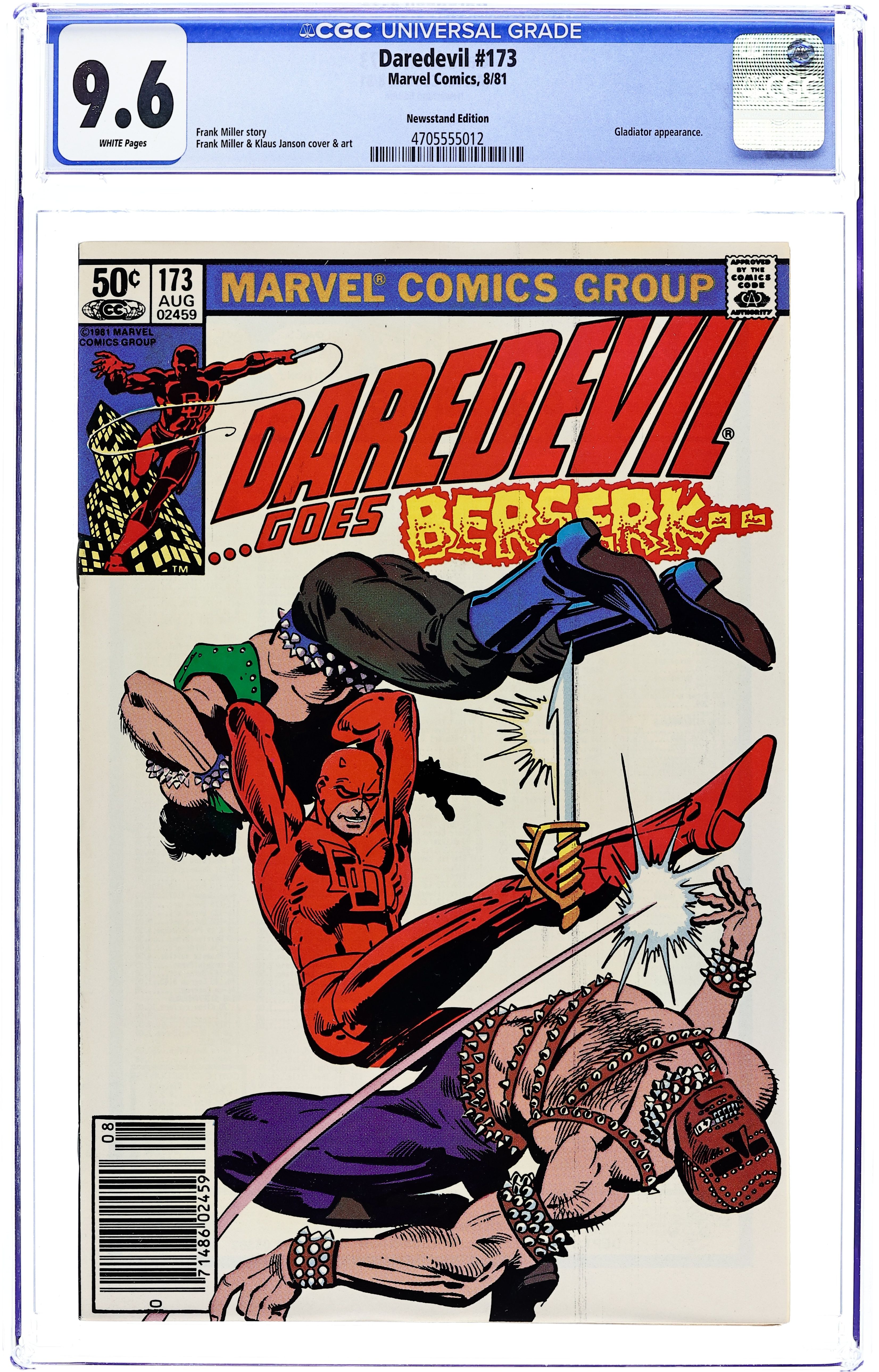 Newsstand Edition. Cover pencils by Frank Miller, inks by Klaus Janson. Lady Killer, script by Frank Miller, pencils by Frank Miller (breakdowns) and Klaus Janson (finished art), inks by Klaus Janson; A lady killer is roaming the streets and he looks exactly like Melvin Potter; DD tracks down the man responsible for crippling Becky and clears the Gladiator; first appearance of Michael Reese. Cover price $0.50.