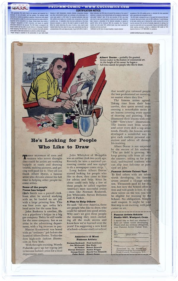 Cover art by Bill Everett. "The Things in the Coffins," art by Joe Sinnott; A drifter takes a job as cemetery caretaker, but when he notices that none of the tombstones have names, he digs one up only to uncover a buried invasion force from Pluto. "A Man of Decision" text story. "Mission to Mars!", art by Ed Goldfarb; In 2253 a diplomatic mission is sent to Mars to trade for food as Earth has been ravaged by atomic war; All of the men take their mission very seriously, except the young pilot who is kind of a class clown; He has a doll which resembles the captain and he makes it do a silly dance but the other men find no humor in his antics. "Russia!", script by Carl Wessler, art by Sam Kweskin; As Anastatia Romanov lies dying, she remembers the events of the Russian revolution and the execution of her family, along with the curse of Rasputin that if harm were to come to him Russia would be ruined. "Come In!", art by Vic Carrabotta; A young man about to enlist visits a fortune teller as he wishes to know if he will be killed in war; The fortune teller gazes into her crystal ball and tells him no, and he is relived until she hands his money back. "The Fat Man," art by Bob Fujitani; The ship's cook and two sailors are stuck on a life raft that reaches an island; The native chief lets the two skinny sailors go, but puts the obese cook in a caldron, as he is quite fat from eating food he hoarded from his comrades. 36 pgs., full color. Cover price $0.10.