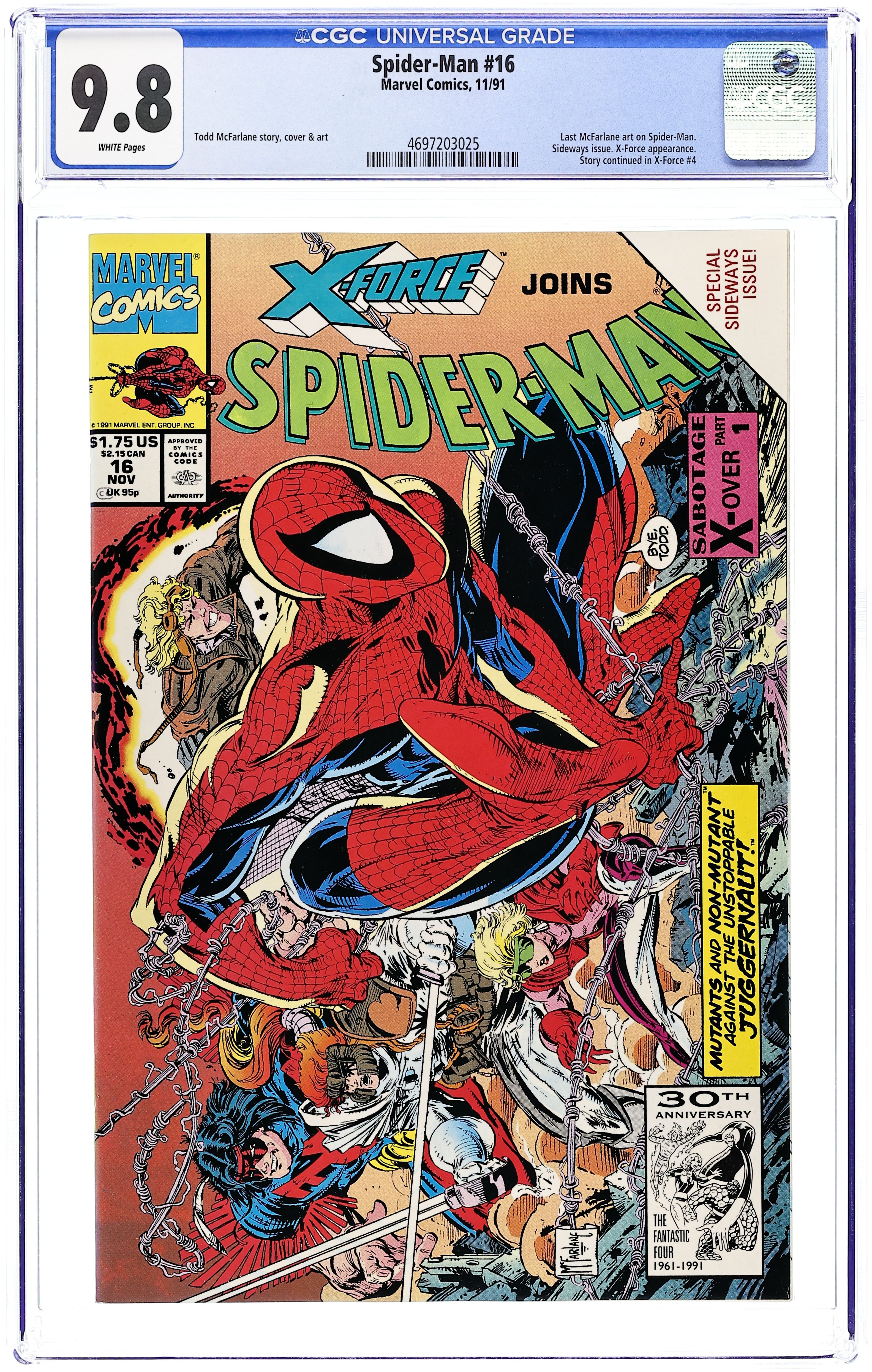 Direct Edition. X-Force crossover. "Sabotage" Part 1 of 2. Guest-starring X-Force. Script and art by Todd McFarlane. Plot assist by Rob Liefeld. Cover by Todd McFarlane. Plot continues from X-Force (1st series) #3. Superstar artist Todd McFarlane's spectacular run on the Spider-Man (1990) title comes to an end with a battle royal on the streets of lower Manhattan! The wall-crawler is web-swinging by the World Trade Center...when he stumbles across a major battle in progress between X-Force and the Juggernaut! Spider-Man knows Cain Marko is nigh unstoppable, but the youngsters of X-Force don't care! Can the web-slinger guide them to victory? Story concludes in X-Force #4. X-Force Lineup: Boom-Boom, Cable, Cannonball, Domino, Feral, Gideon, Shatterstar, Siryn, Sunspot, and Warpath. (Notes: This unique issue is drawn in widescreen/landscape format (horizontal) to maximize the action -- in the same manner as Fantastic Four 252. After this issue Todd McFarlane left Marvel and formed Image Comics with other superstar artists (Jim Lee, Marc Silvestri, and Erik Larsen to name a few). There he created Spawn -- one the most successful creator-owned characters in the history of the medium. Spawn has inspired spin-offs, cartoons, a movie, and one of the most successful toy lines of all time. - Odinson, Lone Star Archivist.) 32 pages. Cover price $1.75.