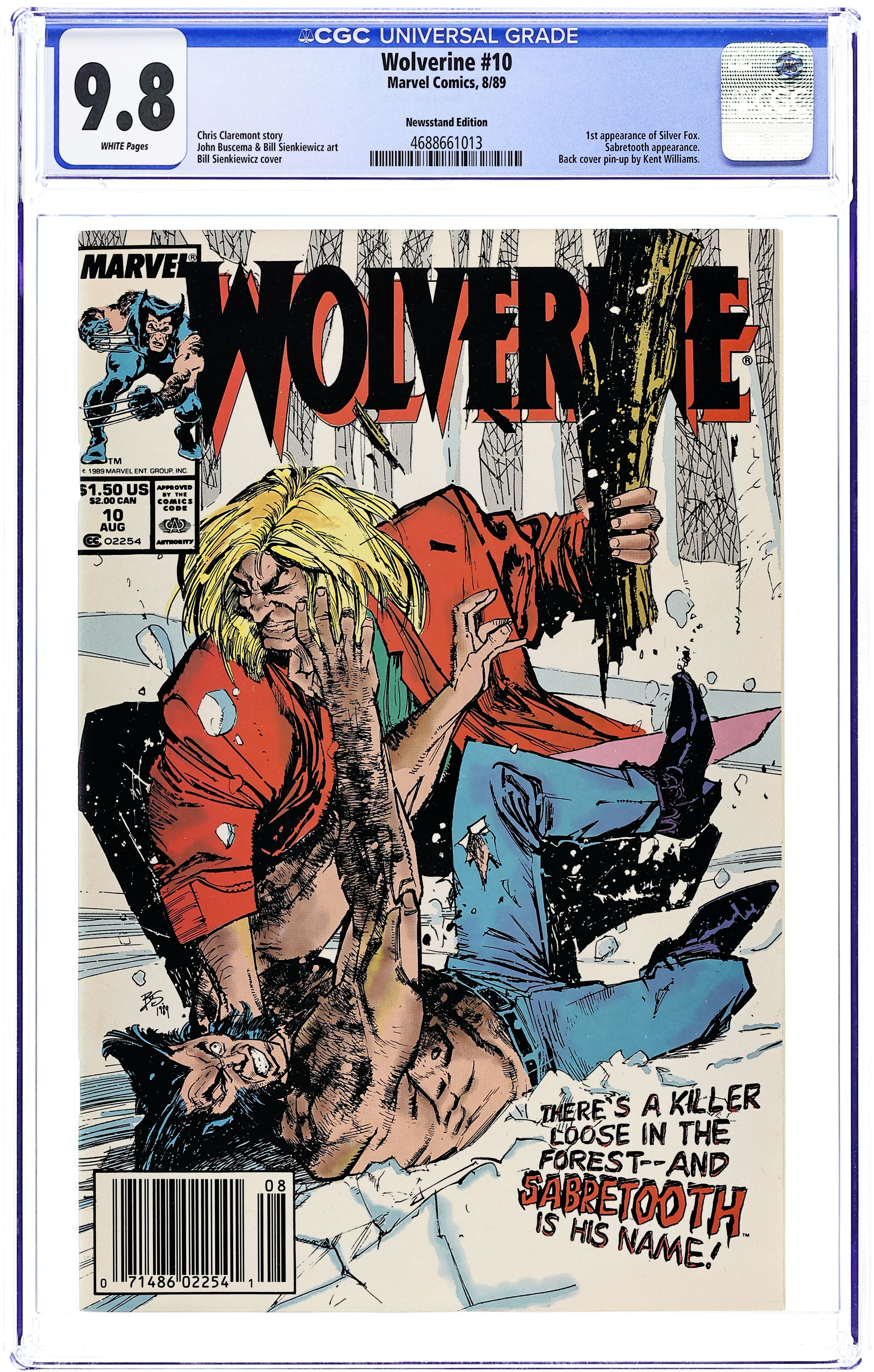 Newsstand Edition. "Hours!" Written by Chris Claremont. Art by John Buscema and Bill Sienkiewicz. Cover by Bill Sienkiewicz. On his birthday, Logan reflects on the murder of Silver Fox, the woman he loved, and Sabretooth, the man that murdered her! Featuring one of the earliest and most brutal battles between these two hated arch enemies. Kent Williams art on back cover (last back cover pin-up). Cover price $1.50.