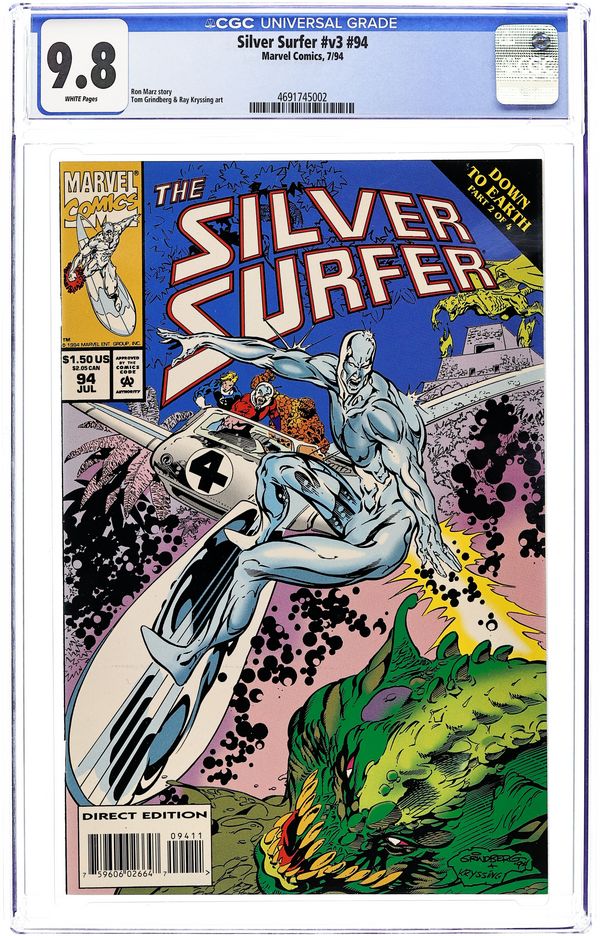Direct Edition. Down to Earth. Part 3 of 4. Guest-starring the Fantastic Four (Thing, Human Torch, and Ant Man). Story by Ron Marz. Art by Scot Eaton and Mike Barrieiro. The Silver Surfer and his allies take on the same cadre of alien Skrulls from Fantastic Four #347-349 and the virtually indestructible Inorganic Technotroid. Plus, a surprise cameo on the last page that just ruins Ben Grimm's day. 32 pages. Cover price $1.50.