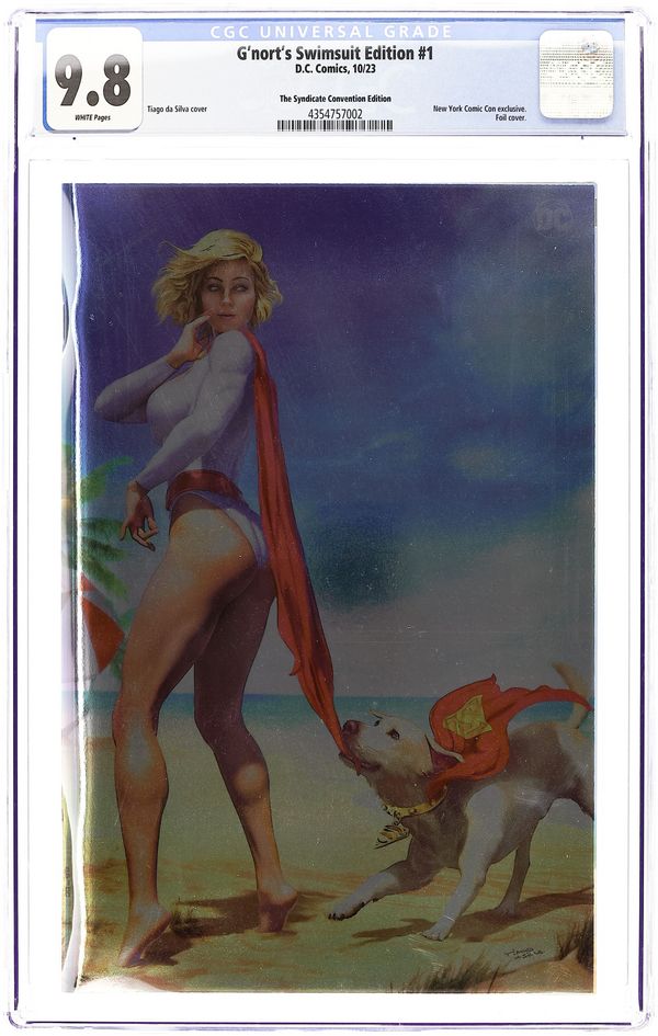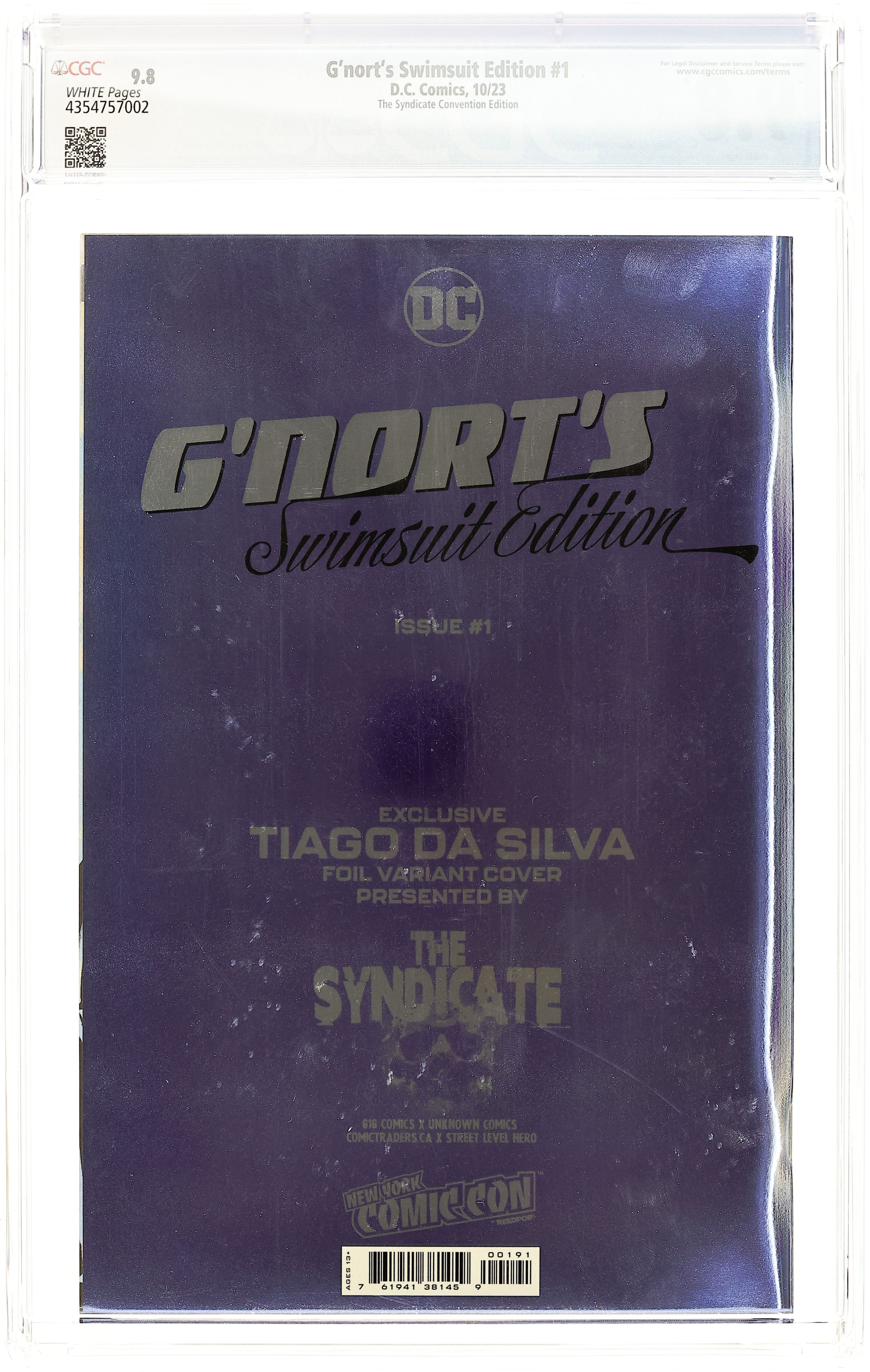 The Syndicate (The 616 Comics, Unknown Comics, Comic Traders, and Street Level Hero) Exclusive Foil Edition Virgin Cover by Tiago Da Silva. Written by Steve Orlando, Various. Art by Various. FUN IN THE SUN STARRING...G'NORT! Art by Paul Pelletier, Nicola Scott, Mikel Janin, Jeff Dekal, Daniel Sampere, Gleb Melnikov, Derrick Chew, Stanley Artgerm Lau, Emanuela Lupacchino, Joelle Jones, Megan Huang, Terry Dodson, Babs Tarr, Pete Woods, Joe Quinones, Helene Lenoble, Otto Schimdt, Michael Allred, Sweeney Boo, David Talaski, Jenny Frison, and others! You may know G'nort as the bumbling Green Lantern who protects Space Sector 68. Then again, you may not know G'nort at all. Whatever the case, get ready to see him in his newest role as host and proprietor of this very special swimsuit edition comic! Join our favorite fuzzball as he showcases some of our best swimsuit covers and our most swim-tacular stories! From the Flash in a Speed Force Speedo to Batman in a bat(hing) suit, this very special one-shot is summer fun from (bikini) top to (bikini) bottom. Also collecting some of the steamiest swimsuit covers from DC's best talent, all in one place for the very first time! 54 pages, full color. Rated T+If you add this item to your want list, we will email you when it becomes available.