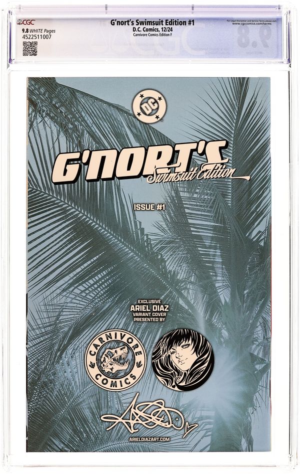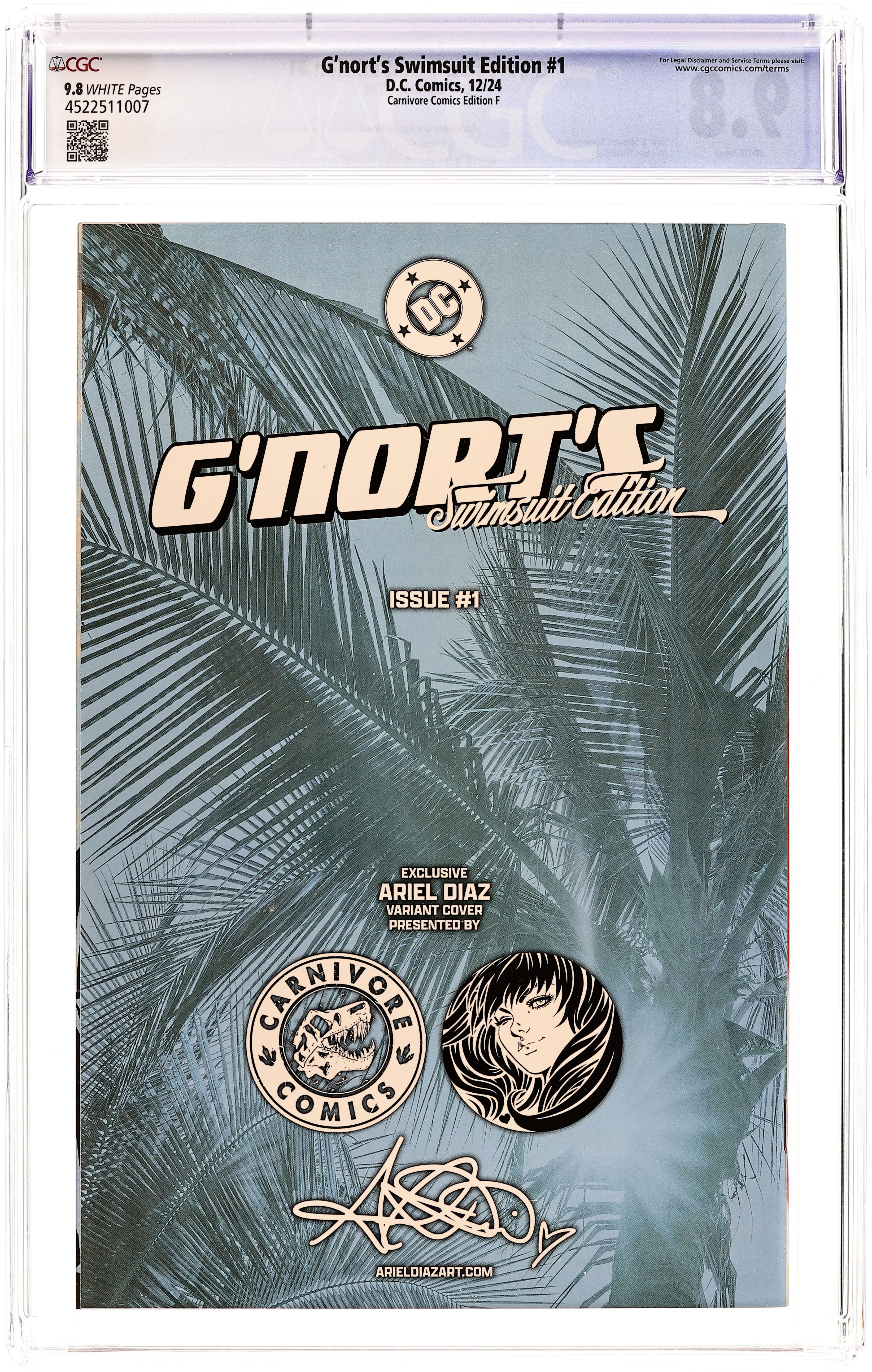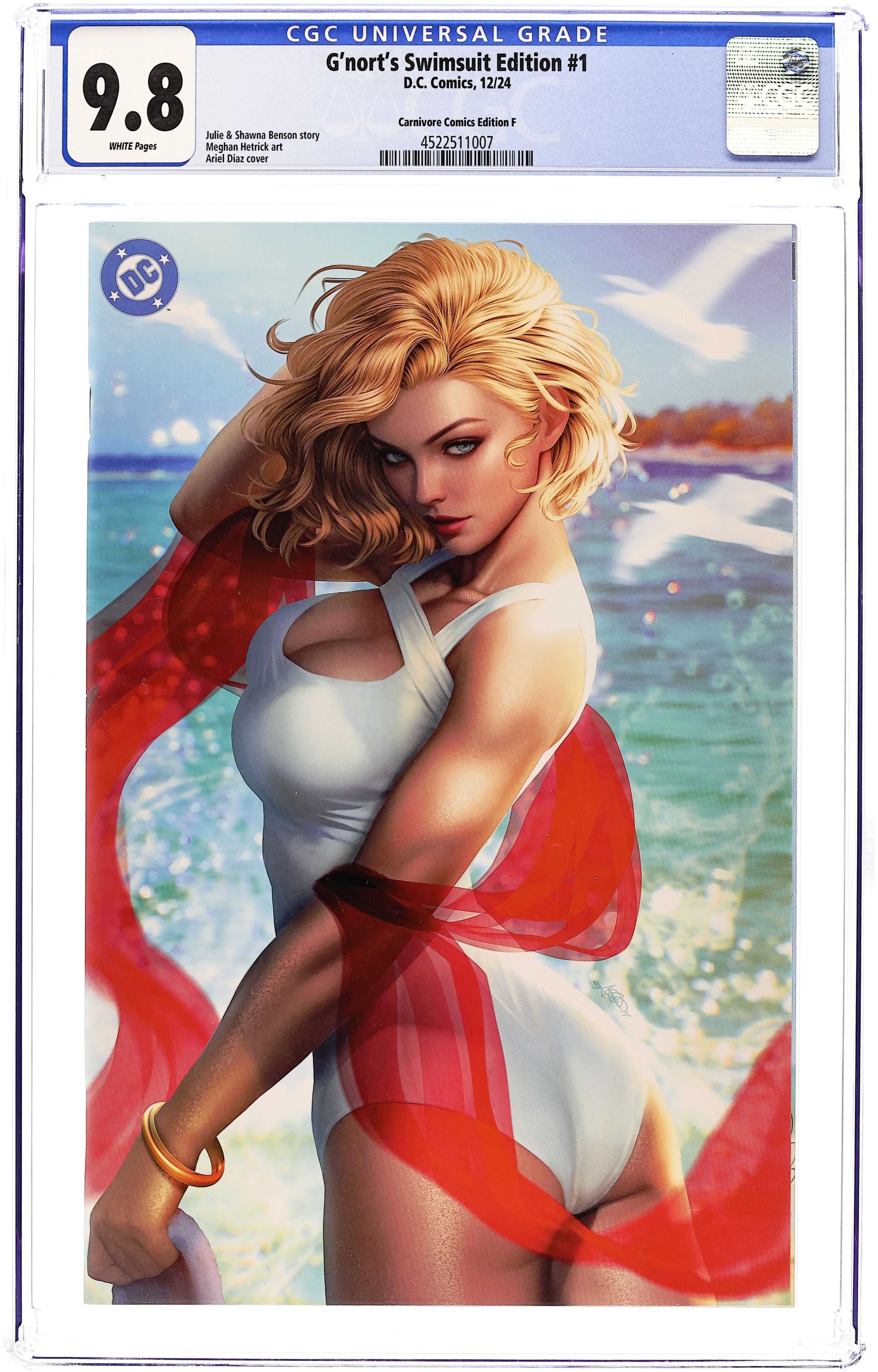 Carnivore Comics Exclusive "Power Girl" Edition Virgin Cover by Ariel Diaz. Written by Steve Orlando, Various. Art by Various. FUN IN THE SUN STARRING...G'NORT! Art by Paul Pelletier, Nicola Scott, Mikel Janin, Jeff Dekal, Daniel Sampere, Gleb Melnikov, Derrick Chew, Stanley Artgerm Lau, Emanuela Lupacchino, Joelle Jones, Megan Huang, Terry Dodson, Babs Tarr, Pete Woods, Joe Quinones, Helene Lenoble, Otto Schimdt, Michael Allred, Sweeney Boo, David Talaski, Jenny Frison, and others! You may know G'nort as the bumbling Green Lantern who protects Space Sector 68. Then again, you may not know G'nort at all. Whatever the case, get ready to see him in his newest role as host and proprietor of this very special swimsuit edition comic! Join our favorite fuzzball as he showcases some of our best swimsuit covers and our most swim-tacular stories! From the Flash in a Speed Force Speedo to Batman in a bat(hing) suit, this very special one-shot is summer fun from (bikini) top to (bikini) bottom. Also collecting some of the steamiest swimsuit covers from DC's best talent, all in one place for the very first time! 54 pages, full color. Rated T+