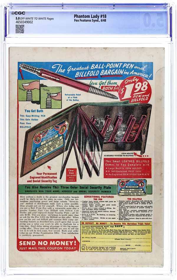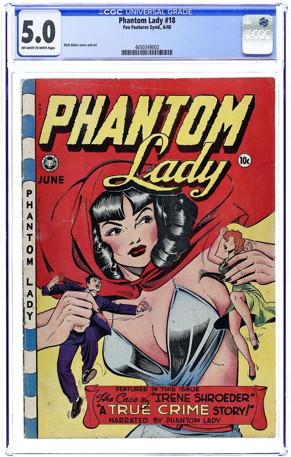 Cover art by Matt Baker. Ghosts, Galleons, and Gold starring Phantom Lady, script by Gregory Page, art by Matt Baker. The Fat Connoisseur starring Phantom Lady, script by Gregory Page, art by Matt Baker. Murder Magic text story. Irene Shroeder, Keystone Hellcat featuring A True Crime Story, art by Carter. 36 pgs. $0.10. Cover price $0.10.