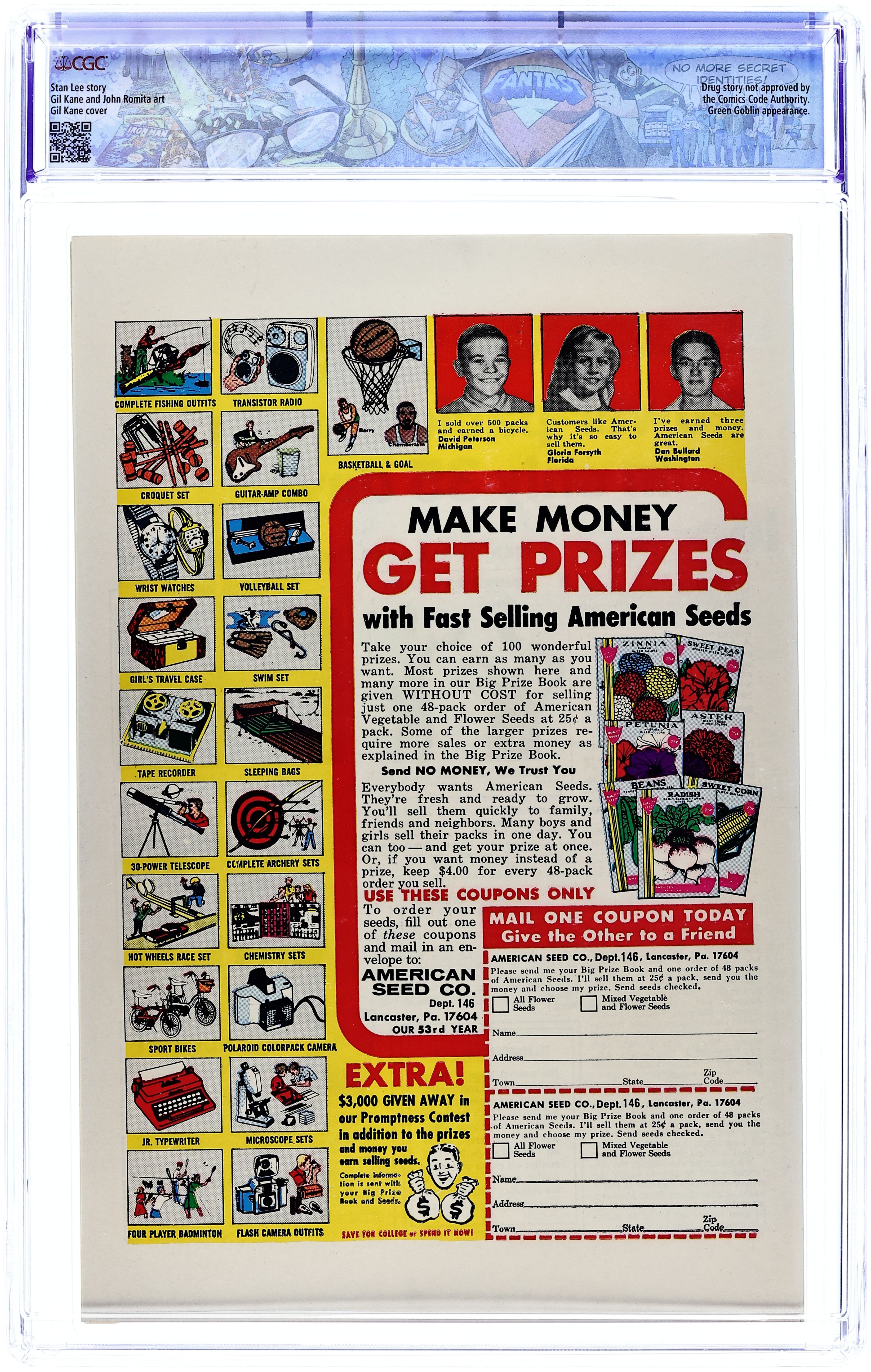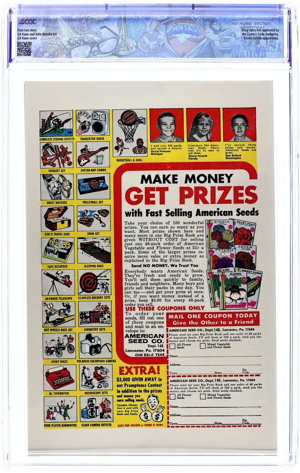 Cover art by Steve Ditko. First appearance of the Green Goblin (Norman Osborn) in The Grotesque Adventure of the Green Goblin!, script by Stan Lee, art by Steve Ditko; The Green Goblin hires the Enforcers to help him defeat Spider-Man; To further his plan he convinces B.J. Cosmos to film a movie of Spider-Man fighting Goblin and the Enforcers in the desert; While filming, Goblin and the Enforcers attack Spider-Man and accidentally awaken the Hulk. Reprinted in Marvel Tales # 9 and 152. 36 pgs. $0.12. Cover price $0.12.