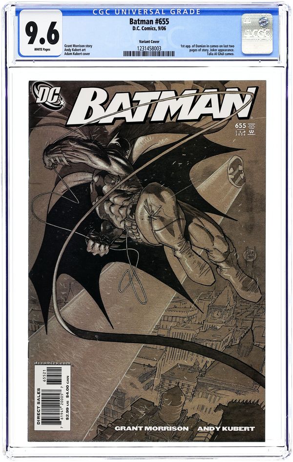 Written by Grant Morrison. Art by Andy Kubert & Jesse Delperdang. Cover by Kubert Part 3 of the 4-part. "Batman and Son," by the incomparable team of writer Grant Morrison and artists Andy Kubert & Jesse Delperdang! Batman brings his son home to Gotham City and introduces him to both Wayne Manor and the Batcave! But when Batman's new son meets Robin sparks ? and swords ? will fly! 36 Pages, Full Color. Cover price $2.99.
