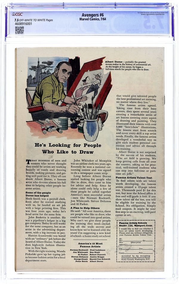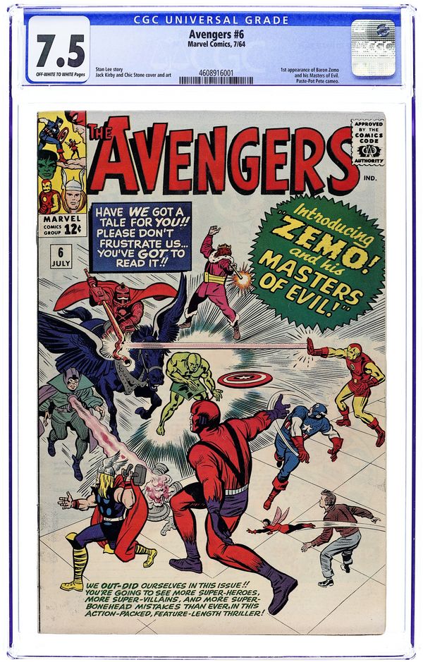 Cover pencils by Jack Kirby, inks by Chic Stone. First full appearance of Baron Zemo, and first appearance of the second Black Knight in "Masters of Evil!", script by Stan Lee, pencils by Jack Kirby, inks by Chic Stone; Baron Zemo, the man behind the cause of Bucky's death discovers that Captain America is still alive; Collecting together the Black Knight, Radioactive Man and the Melter, the Masters of Evil are formed; While the Masters of Evil spray the city with 'Adhesive X', a powerful glue for which there is no solvent, the Avengers attack; Captain America and Giant-Man get trapped by the adhesive and the Avengers withdraw to try and find a solution for it; Wasp remembers that a criminal behind bars called Paste-Pot Pete might be able to help; After receiving the solution they free Captain America and Giant-Man, and attack the Masters again. Special bonus: The letter column in this issue leads off with a letter from Buddy Saunders, the owner of MyComicShop. Oh, for the halcyon days of our callow youth! In the letter Buddy tells Stan and Jack that Avengers #4, with the return of Captain America, was one heck of a great issue. Time has certainly proven him right! 36 pgs., full color. $0.12. Cover price $0.12.