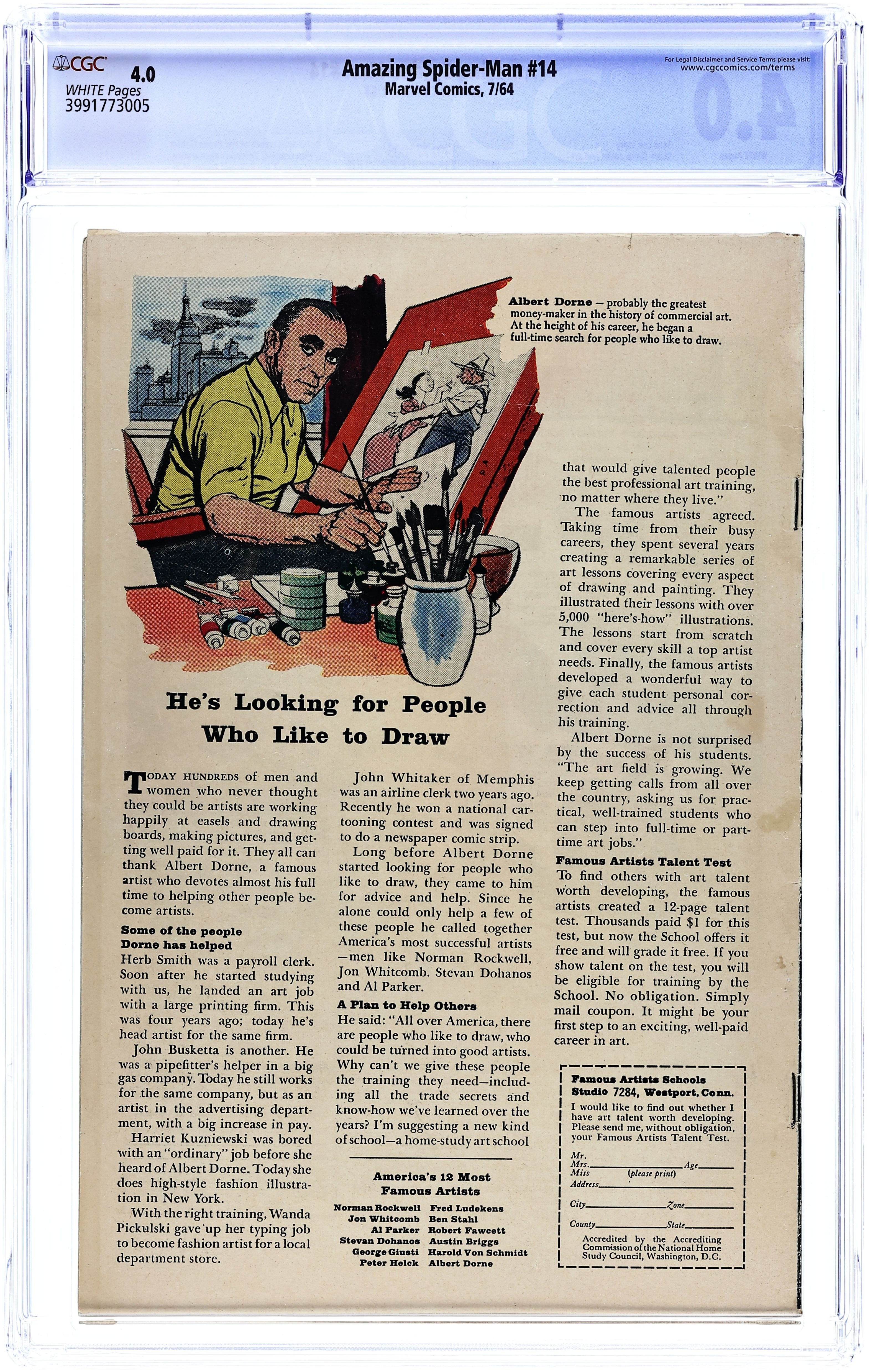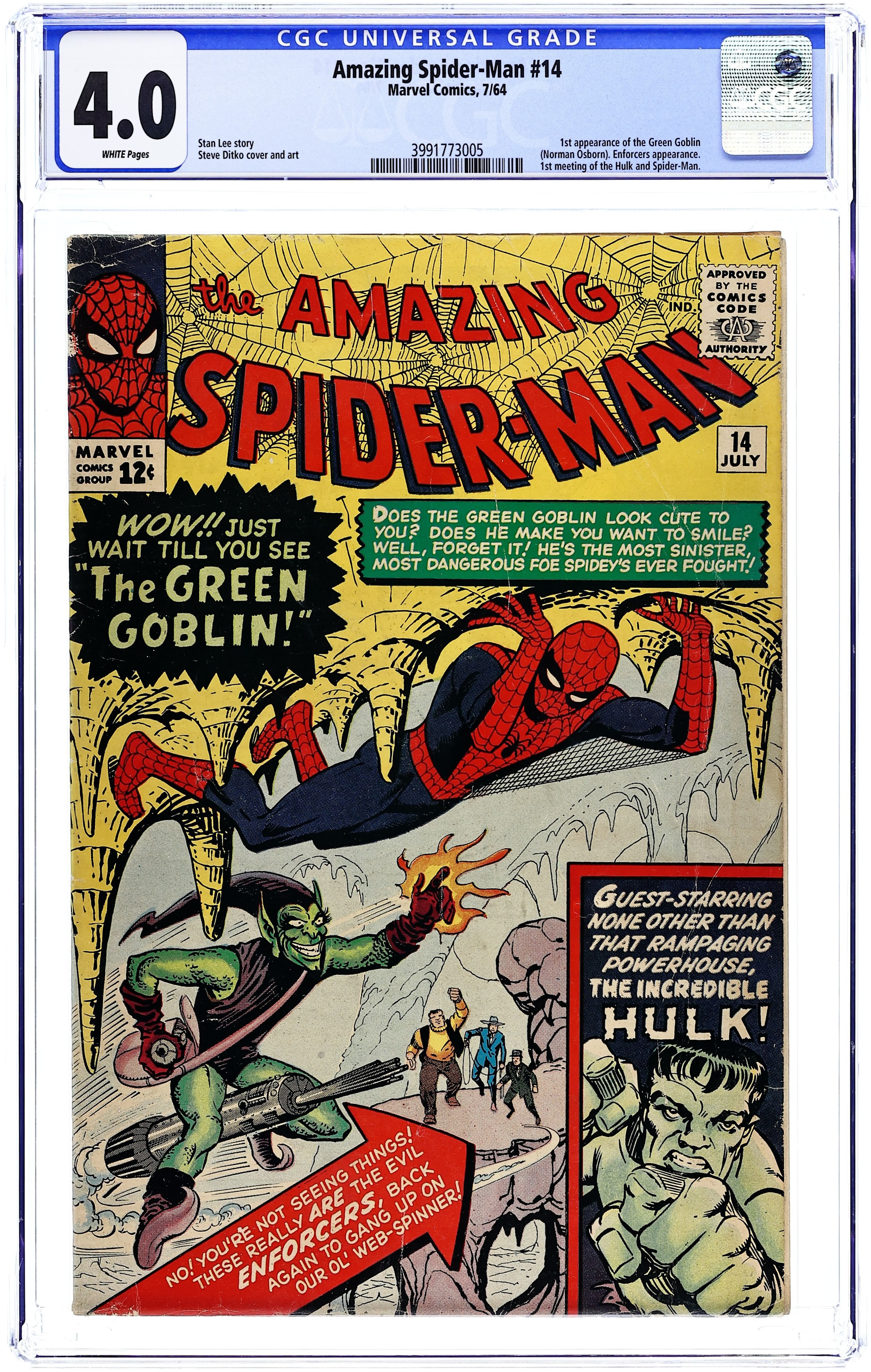 Cover art by Steve Ditko. First appearance of the Green Goblin (Norman Osborn) in The Grotesque Adventure of the Green Goblin!, script by Stan Lee, art by Steve Ditko; The Green Goblin hires the Enforcers to help him defeat Spider-Man; To further his plan he convinces B.J. Cosmos to film a movie of Spider-Man fighting Goblin and the Enforcers in the desert; While filming, Goblin and the Enforcers attack Spider-Man and accidentally awaken the Hulk. Reprinted in Marvel Tales # 9 and 152. 36 pgs. $0.12. Cover price $0.12.